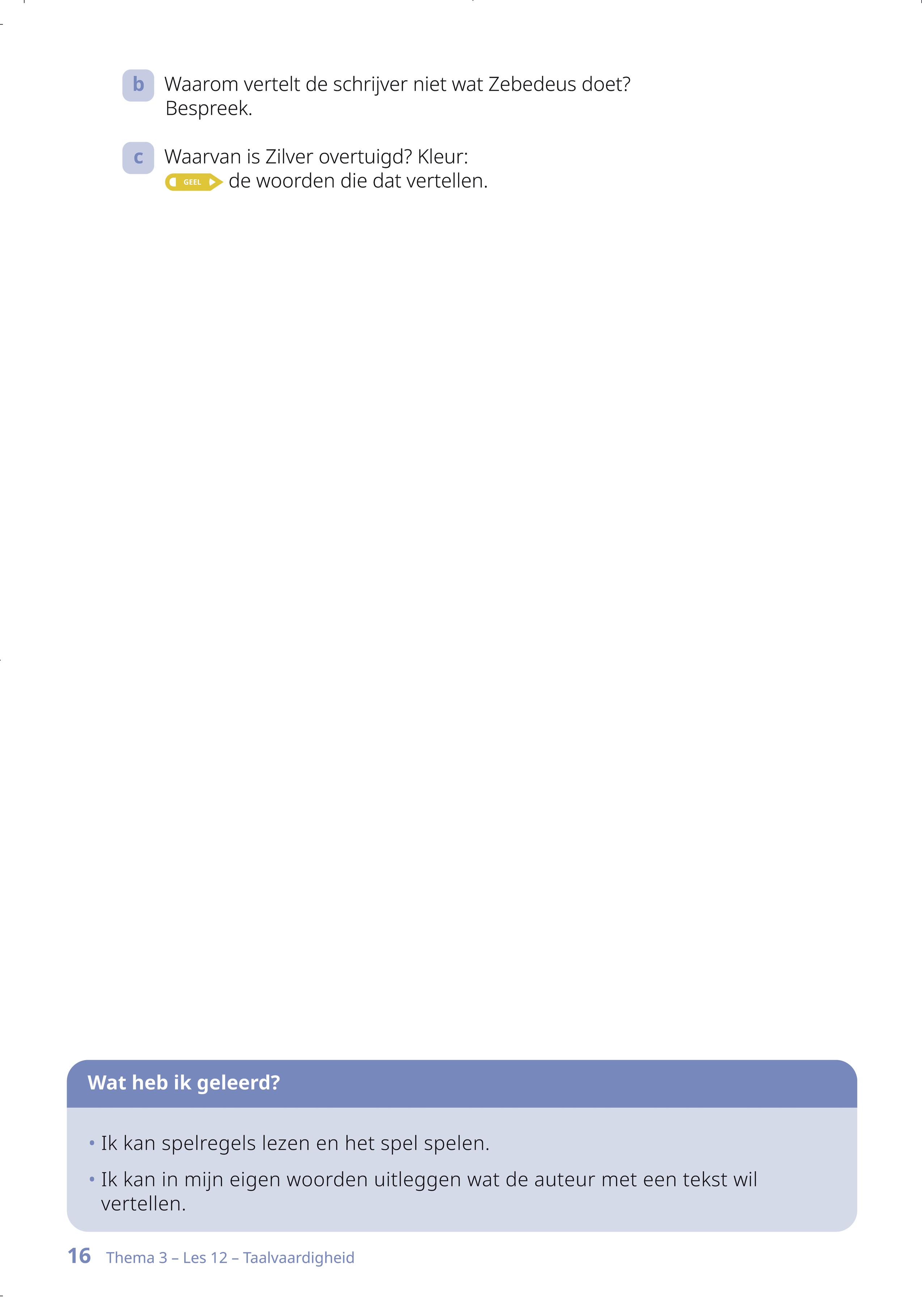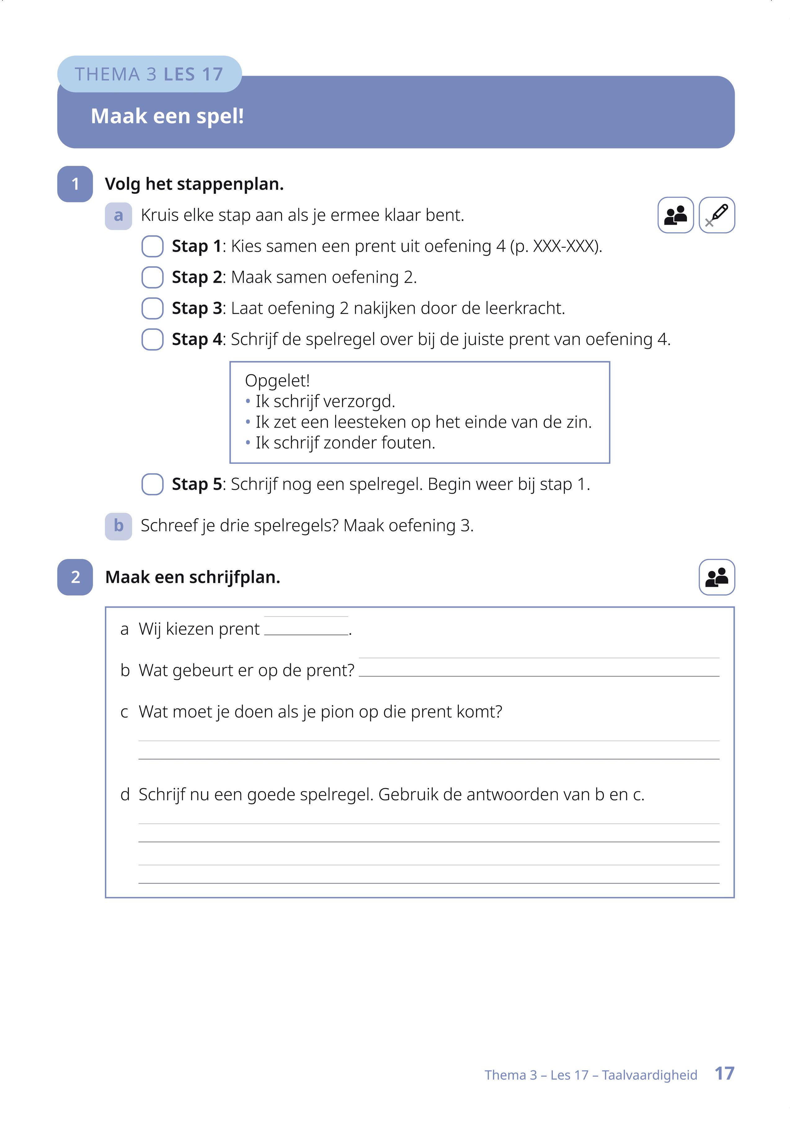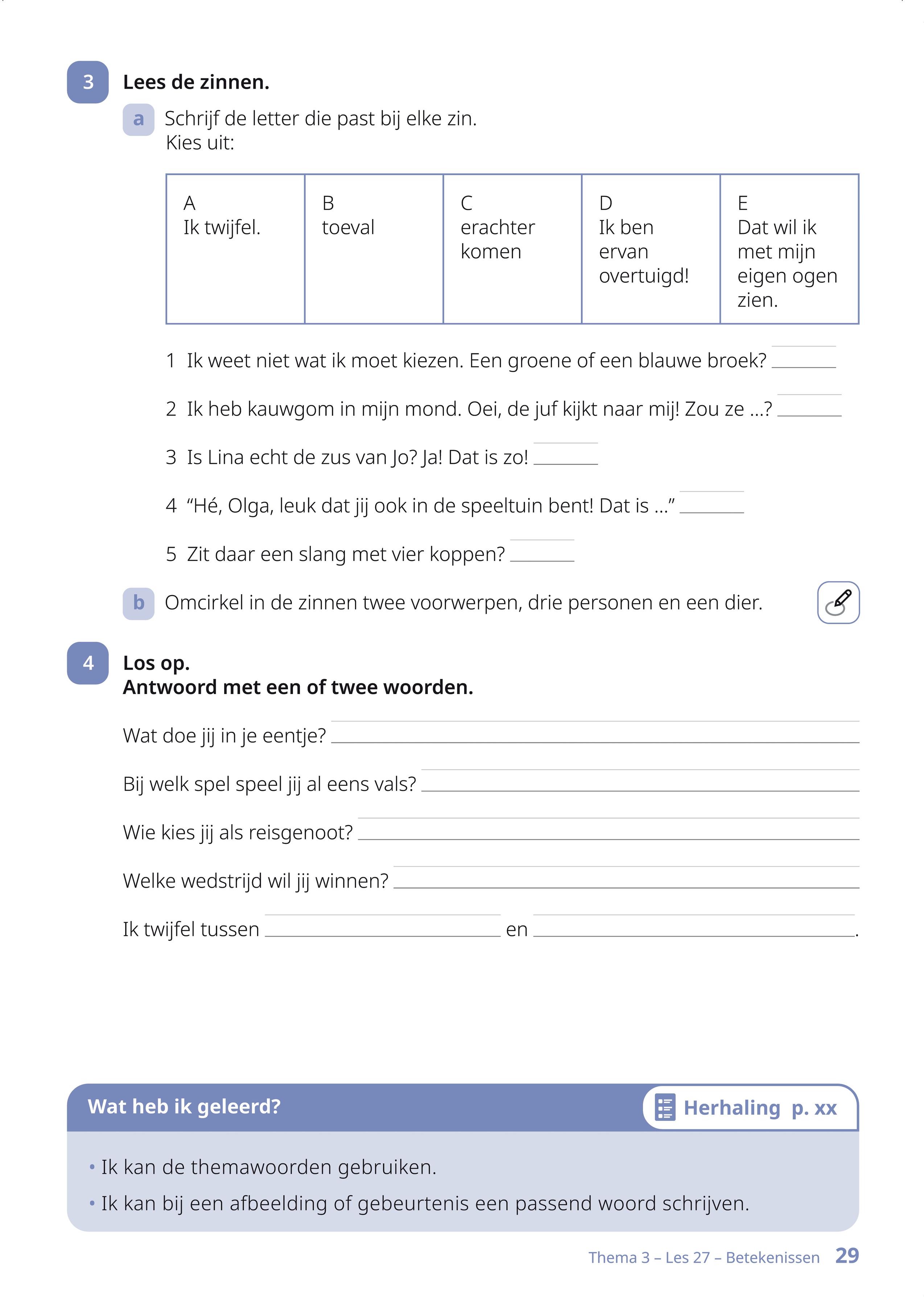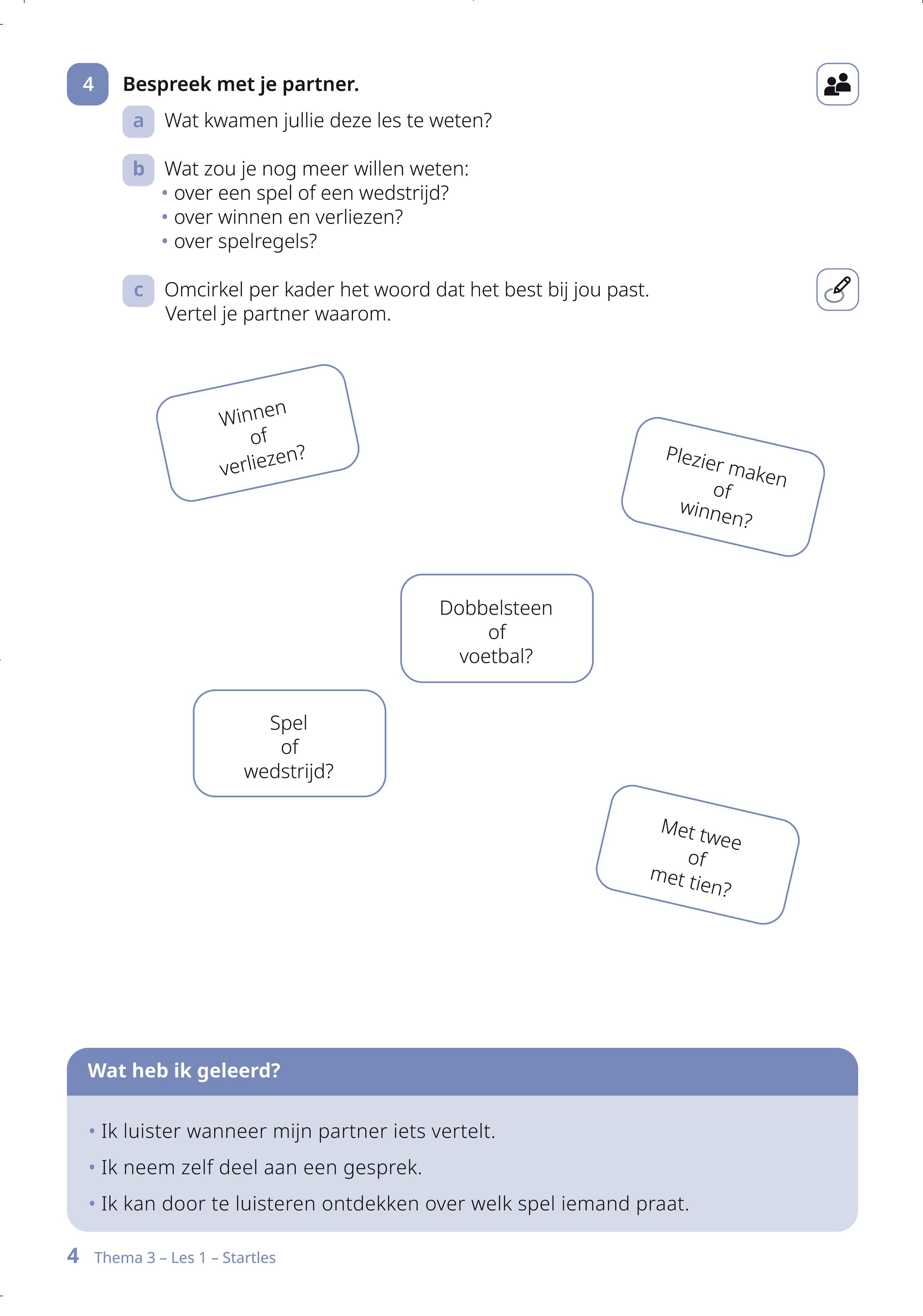 Op het einde van de les bespreek je de mate waarin je leerlingen de lesdoelen bereikten. Op de herhalingspagina duid je samen aan wie er tijdens de herhalingsweek nog extra oefening rond die doelen kan gebruiken.