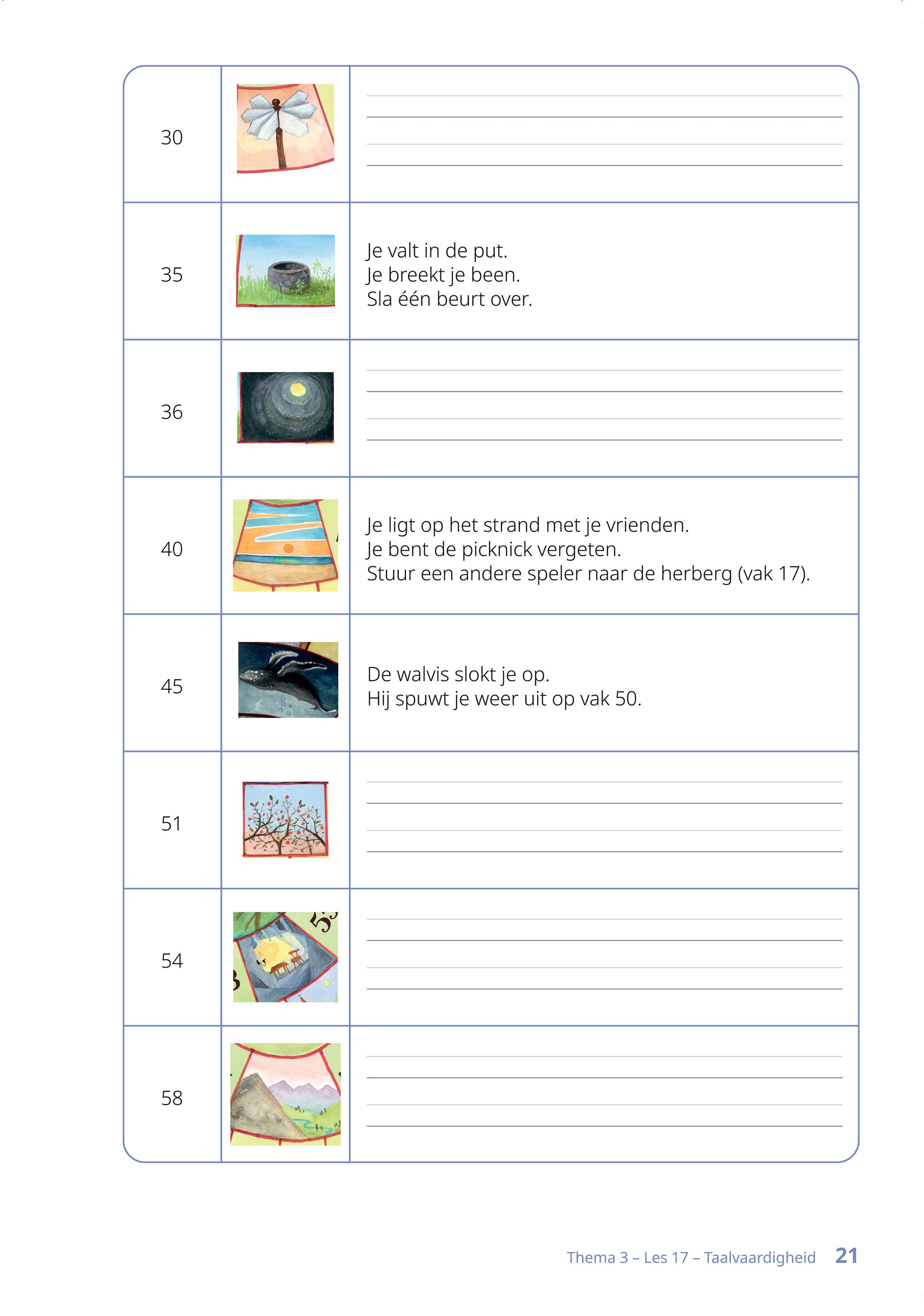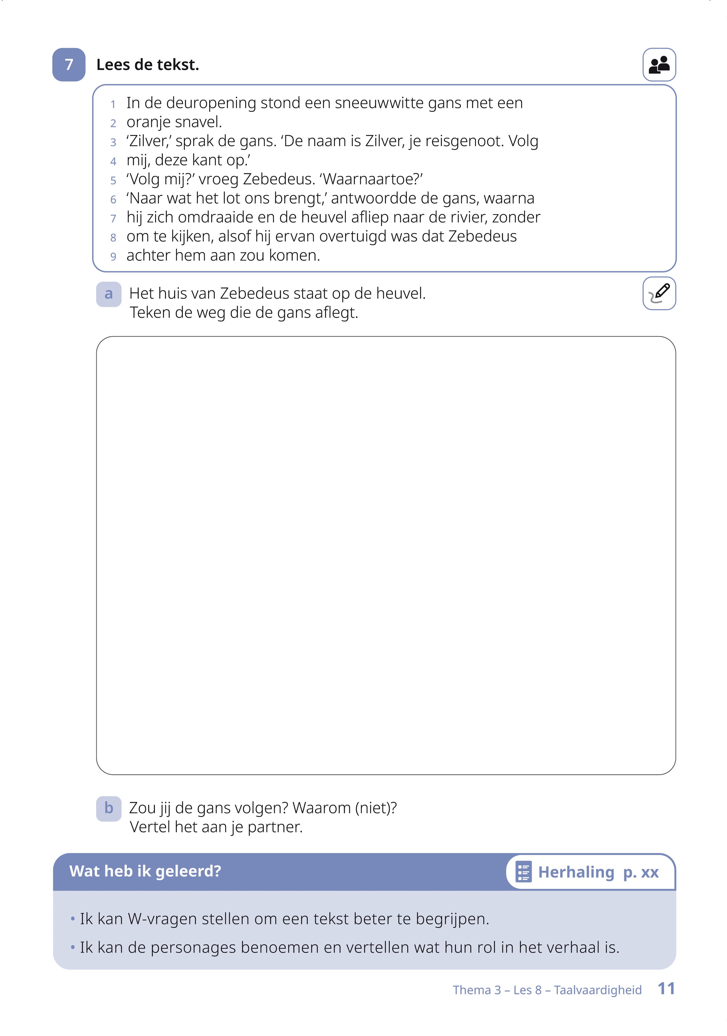 Op die herhalingspagina wordt verwezen naar extra oefenmateriaal bij die doelen, dat achteraan in het taalschrift staat. Zo weten de leerlingen meteen welke oefeningen ze nog kunnen maken.