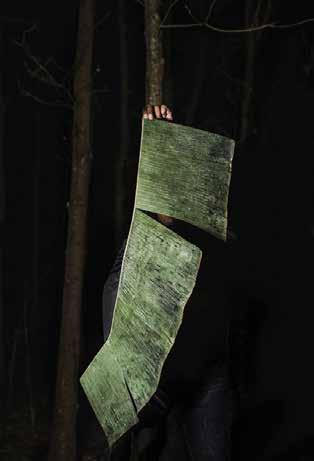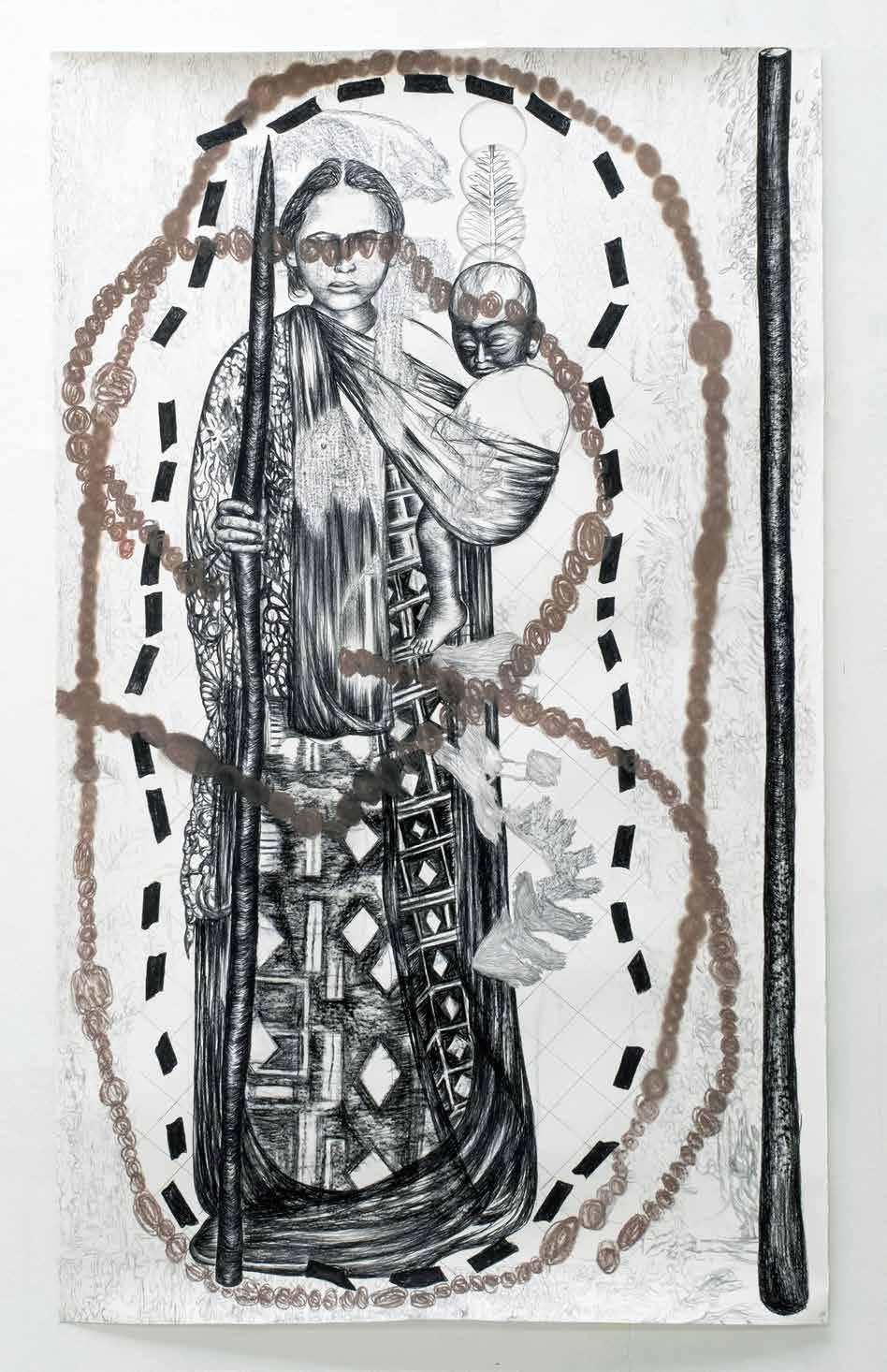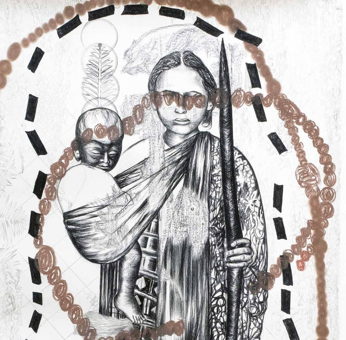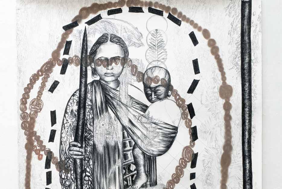 In de Indonesische traditie worden veel objecten, zoals de kris of wayangpoppen, geacht een eigen levenskracht te bezitten. Komt dit tot uiting in de materialen die je gebruikt? Ik werk zoveel mogelijk met duurzame en natuurlijke materialen van hoge kwaliteit: sterk geschept Arches-papier, linnen, goede potloden. Planten zoals varens en sirihblaadjes, hout, wol of katoen kunnen ook in het werk terugkomen. De manier waarop je met het materiaal omgaat bepaalt mede het karakter van het werk. e manier van werken is liefdevol, bijna alsof je voor een levend wezen zorgt. Je praat soms tegen een schilderij of tekening, maar vooral laat je het ontstaan op zijn eigen tempo. Dat is heel belangrijk. Niet opjagen of forceren, ook al vraagt de wereld veel van je als deelnemer aan de maatschappij. Je zorgt ervoor zoals voor een bloem. Dan wordt het mooi. Het werk voorzichtig neerleggen, goed verpakken tegen de kou, het beschermen. Heilige natuur. Qi. De bron van alles, ook in leven en doen. Het is een organische manier van werken, waarbij tijd een belangrijke rol speelt. Het werk ontwikkelt zich op eigen merites, zoals een boom of plant groeit. Dat geeft het een duurzaam en bijna helend karakter.