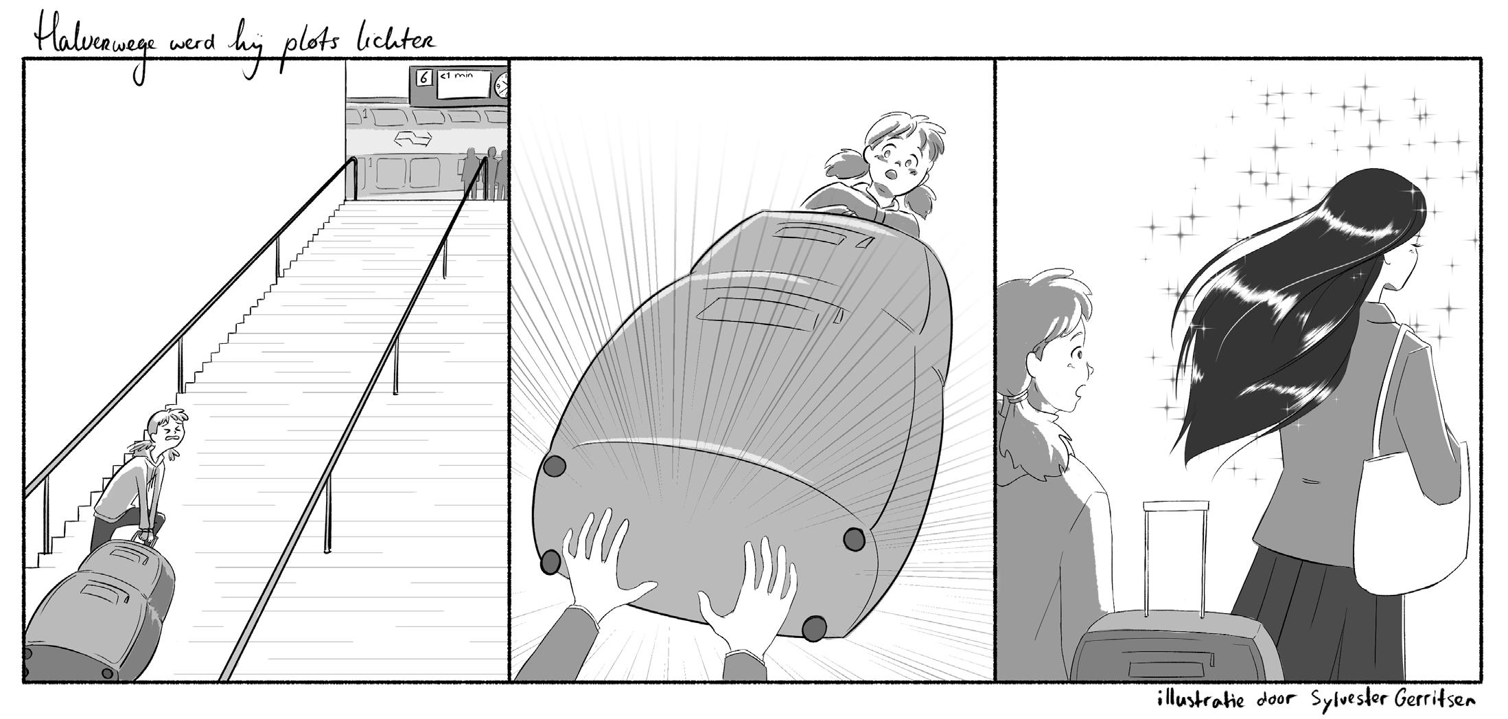 De trap leek eindeloos. De trein bijna weg. Tot het opeens vanzelf ging. Bovenaan begreep ik waarom: jij had de onderkant van mijn koffer even opgetild.
