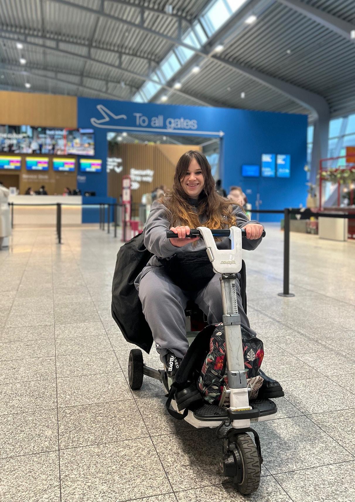 ‘Today I’m going to Oslo to attend a concert. I left Rotterdam at 8:15 this morning. Someone took me to the train station, I took the train to Eindhoven, and then the bus at Central Station to the airport. I need help getting on both the train and the bus.” Sharon is using Eindhoven Airport for the first time. “It’s a short trip this time. I’m staying in Norway until Sunday and attending Norwegian artist TIX’s concert. He participated in the Eurovision Song Contest in 2021. That was in Rotterdam. I liked him; his music stuck in my head. And now I’m going to his concert, which is really great!” Sharon is travelling with her own mobility scooter. It’s foldable and the size of a trolley. “That gives me freedom.” I can travel independently, and I’m very happy about that. This is my first time at Eindhoven Airport. There’s a special check-in desk for people in wheelchairs. It’s clearly marked. The words “Wheelchair, I’ll be checking in there” are written in large letters on the wall.’