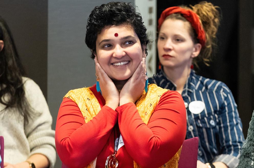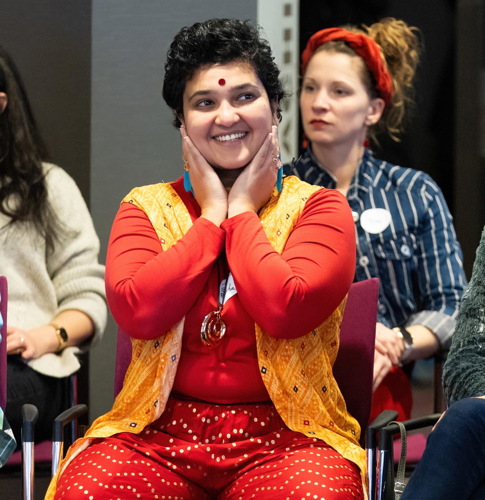Shena Rani Augustine: “Instead of an ordinary conference hall, I saw chairs arranged in beautiful circles, with comfortable cushions, markers, and paper in the middle. It felt immediately familiar and reminded me of the ‘sacred circles’ in my own practice. Sitting in such a circle, where you can see everyone, had something surreal about it.’
