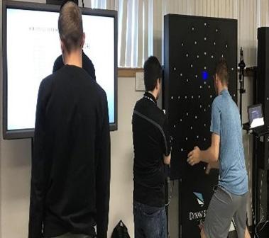 As for the space boards and flashing lights, these 45-inch screens and tablets help with depth perception, reaction times, and hand-eye coordination. Many of the games used here are used in the NFL draft as well. The dot and light drill are used to see