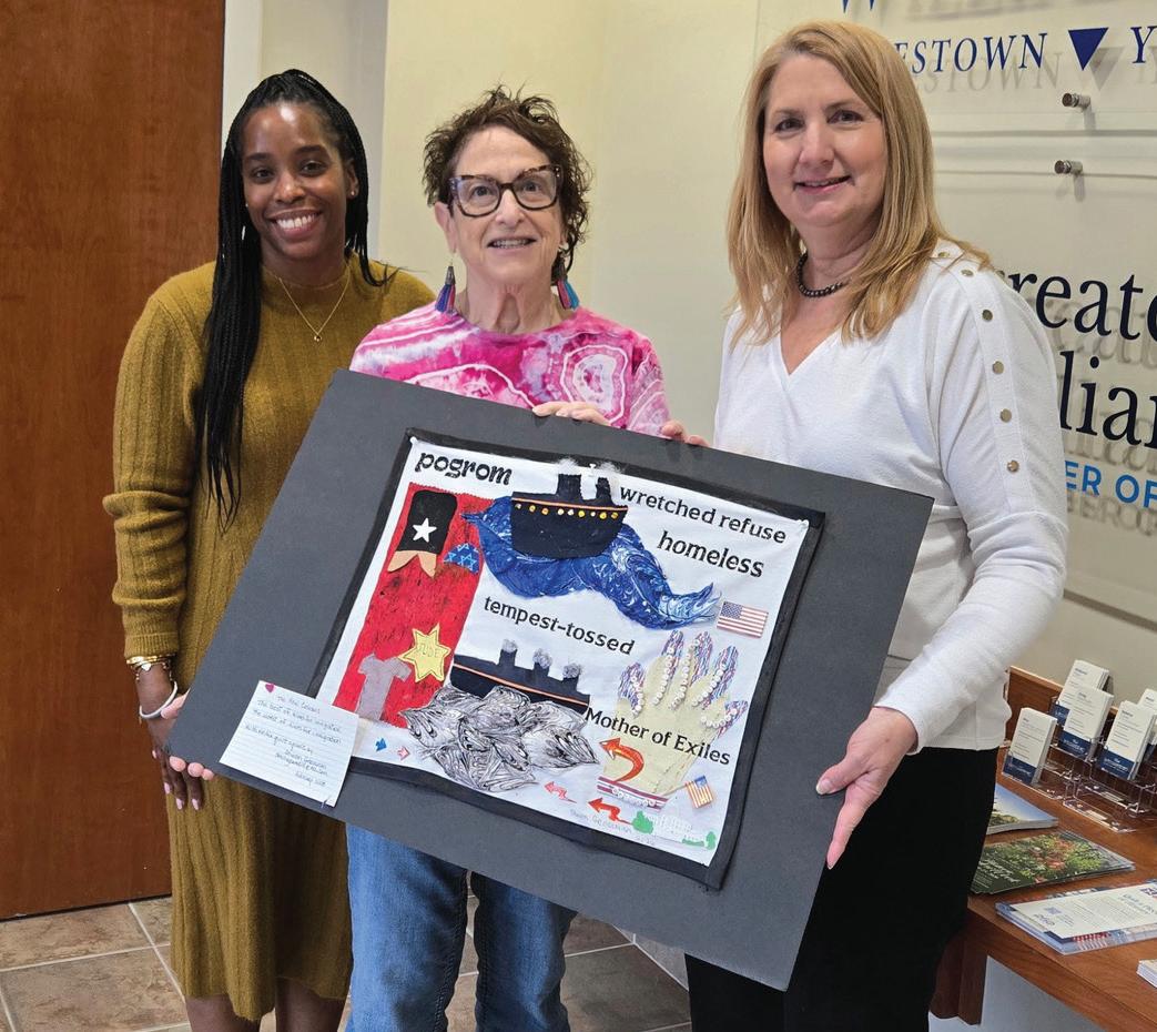 Grossman’s 16”x20” block (same size as Gruber’s) reminds that Jews fled pogroms in Eastern Europe and came to this country, most passing by the Statue of Liberty, erected in the New York harbor in 1886. “As most of us know, Emma Lazarus’ poem called The New Colossus, which is on the statue, includes the words, ‘give me your tired, your poor, your huddled masses yearning to breathe free.’ Those words speak to me, so I decided to use the welcoming of foreigners, and particularly Jewish ones, as my theme.”