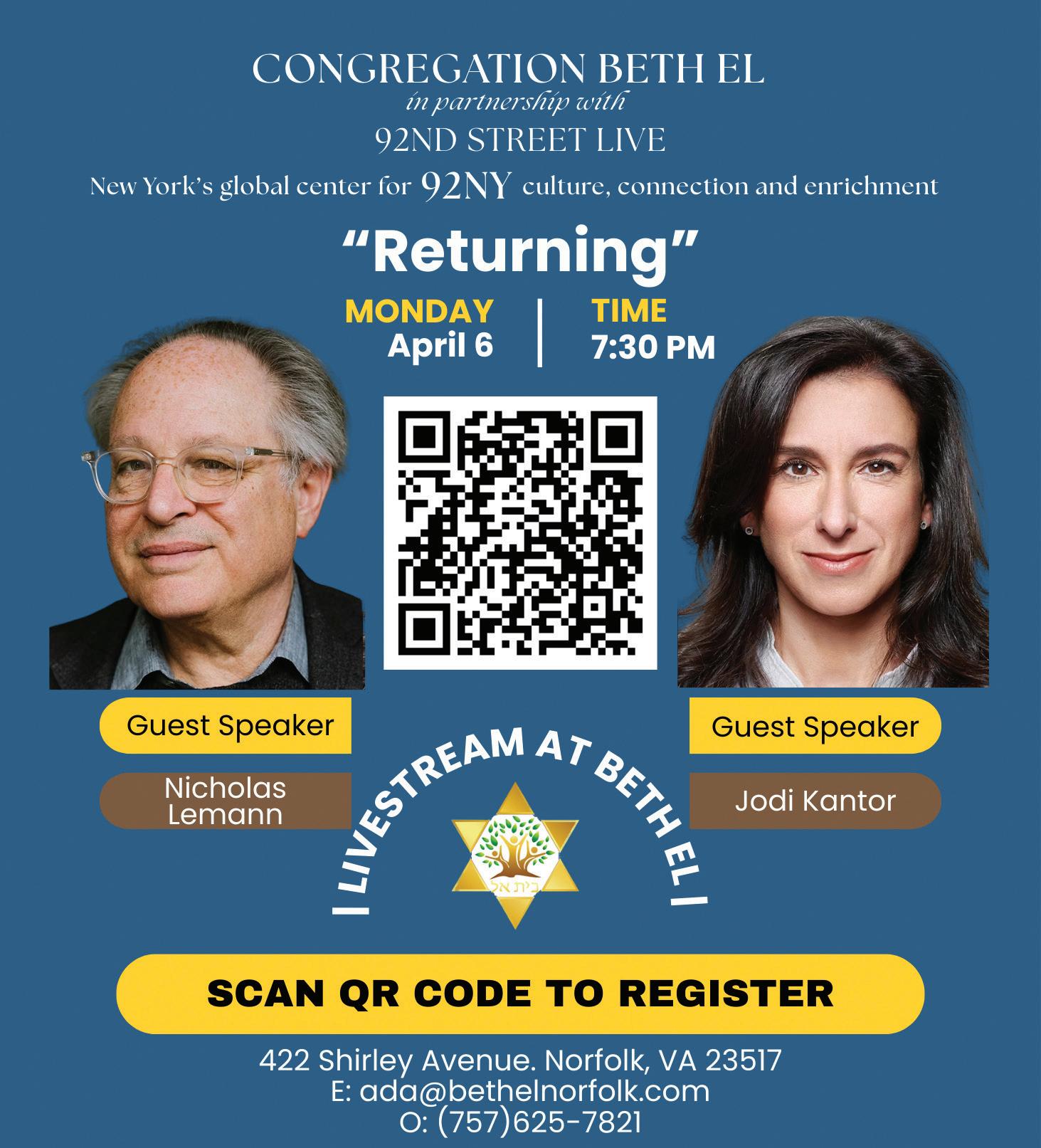 Yom Ha’Atzmaut Community Celebration, a joyful festival honoring Israel’s 78th Independence Day and the strong connection between Israel and Tidewater’s Jewish community. This community-wide event brings together families, friends, and organizations from across the region for an afternoon of Israeli culture, music, food, and interactive activities for all ages. Sandler Family Campus. 12 - 3 pm. Information and registration: JewishVA.org/YH or contact Nofar Trem at NTrem@UJFT.org.