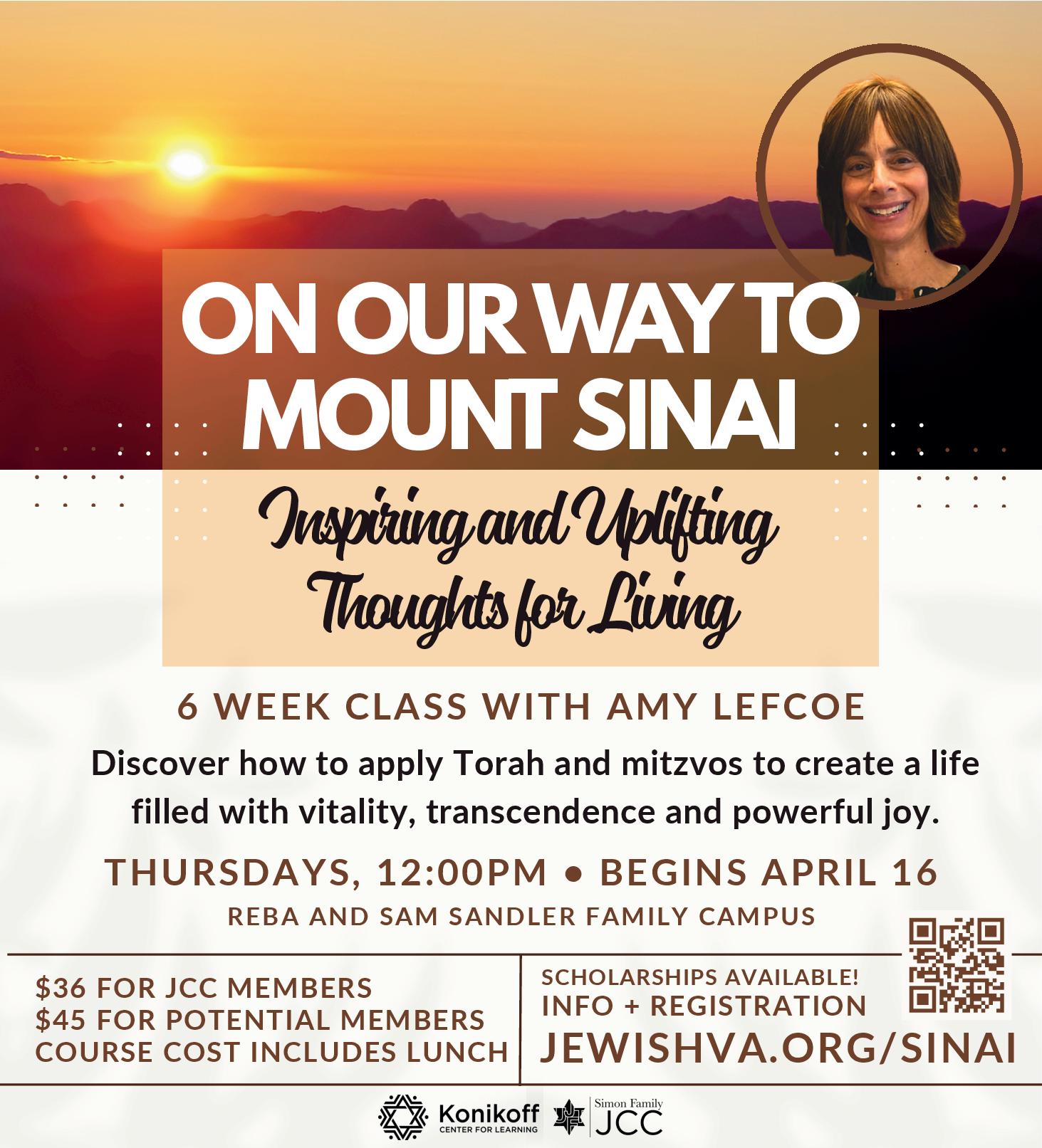On Our Way to Mount Sinai: Inspiring and Uplifting Thoughts for Living. Join Jewish educator Amy Lefcoe for 6 weeks of inspirational learning during this auspicious time of year known as the Omer period. Discover how to apply Torah and mitzvot to create a life filled with vitality, transcendence, and powerful joy. 12 pm. Sandler Family Campus. $36 for JCC members, $45 for potential members. Register at JewishVA.org/KCL. Cost includes lunch. Scholarships available. Information: Sierra Lautman at SLautman@ujft.org.