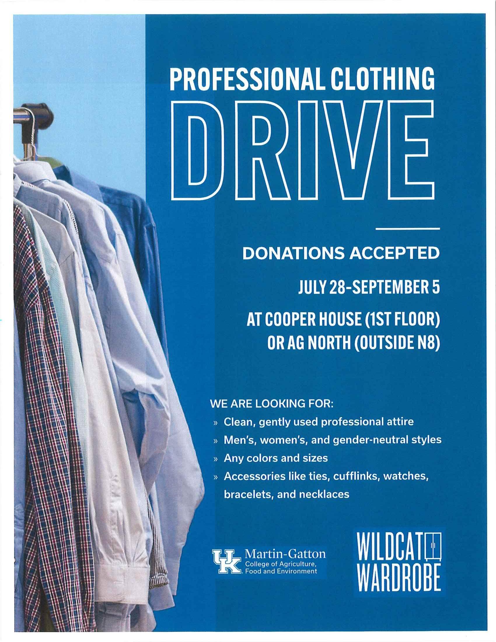 The Center for Student Success, in partnership with Wildcat Wardrobe, is hosting a professional clothing drive (July 28Sept. 5) and a pop-up (Sept. 11, 10 a.m.-1 p.m.) at the Ag Science Center North ground floor lobby. Wildcat Wardrobe provides free business professional clothing (suits, dresses, pants, shirts, skirts, shoes and accessories) to all University of Kentucky students regardless of financial need. Students can select up to three items for free by presenting their UK ID.