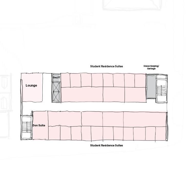 Vegetation and gardens surrounding the SEC create calm, restorative spaces that enhance well-being and foster social interaction. A sunken garden connects the SEC to the Quad, serving as an outdoor extension of lounges and cafés, suitable for study, relaxation, and informal gatherings. Native plants provide privacy, ecological resilience, and seasonal interest, while water features support microclimates and sensory engagement. Perimeter gardens around adjacent buildings act as thresholds and circulation nodes, integrating seating, bike parking, and sustainable planting strategies. Preserving mature trees and designing planting beds for long-term health reinforces the connection between the built environment and nature, enhancing ecological and aesthetic value across the campus.