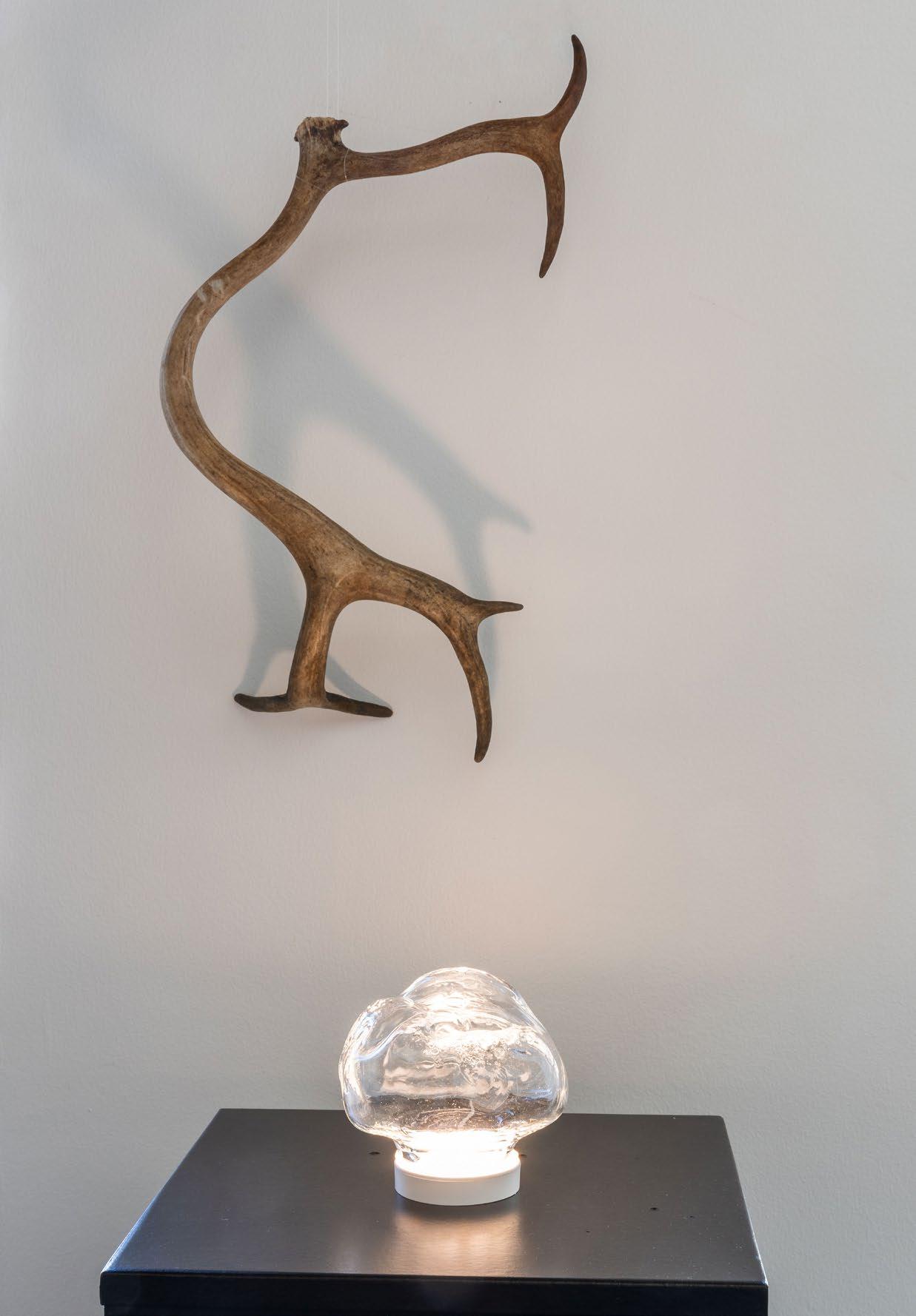 Kirkas suupuhallettu lasi, pintakuviointi lumella ja poronsarvella.