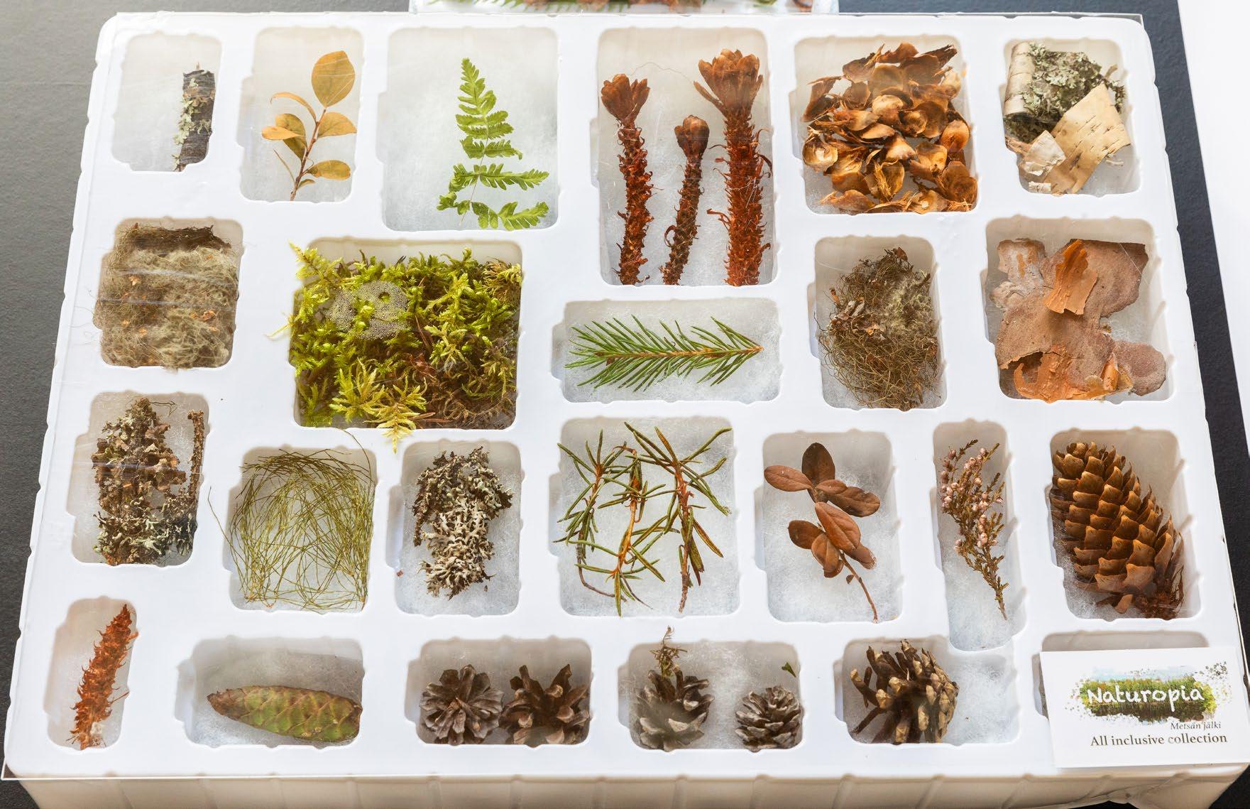 Teokseni koostuu kuvitteellisista Naturopia -brändistä ja tuotemerkistä, jonka alla suomalaisen metsän irto-osasia kaupataan maailman metropolien asukkaille altistamaan hyvinvointia tukevalle mikrobistolle. Installaatiossa on prototyyppejä tuotteista pakkauksissaan. Olen kerännyt kasvit maanomistajan luvalla.