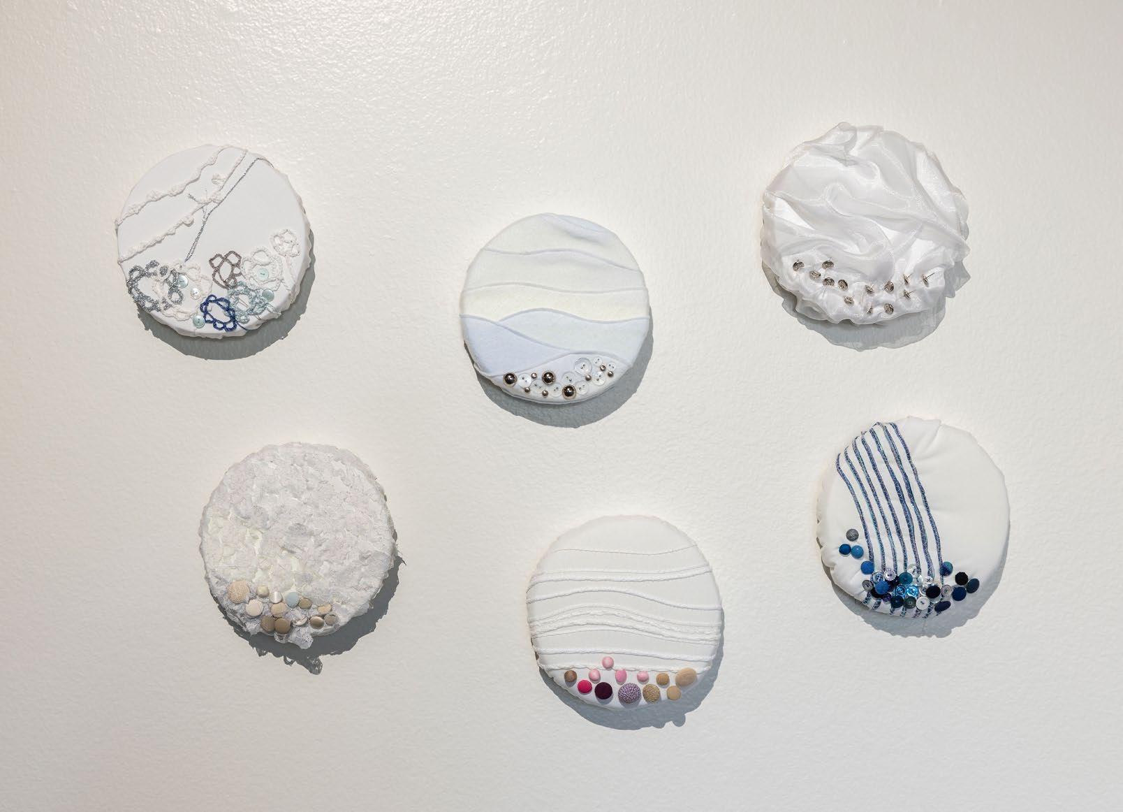 Maisema siluetit -teossarja on saanut alkunsa näyttelyn teemasta Ihmisen jälki. Teema inspiroi minua yhdistämään ihmisen tuottaman jäljen osaksi luontoa. Tein erilaisilla tekstiilimateriaaleilla ja -tekniikoilla valmistettuja pintoja, joista on havaittavissa maisemasilhuettimaisia muotoja. Pintoihin lisäsin ihmisen jäljen teollisesti tuotetuilla elementeillä kuten napeilla ja hakaneuloilla.