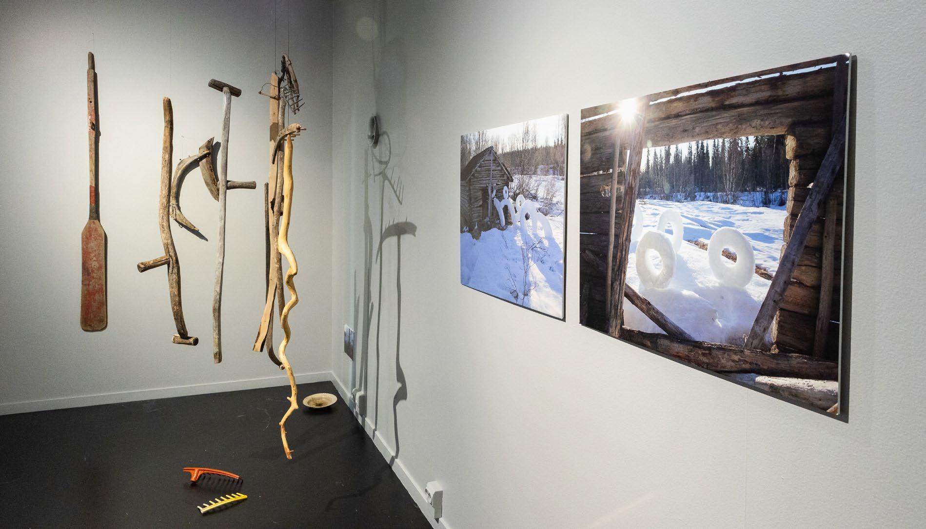 Installaatio, valokuvat ja heinätyökalujen osia, Ketinsaari, Ounasjoki.