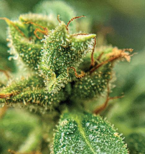 Close-up of ex vitro Cannabis sativa L. during flowering displaying trichrome colorization