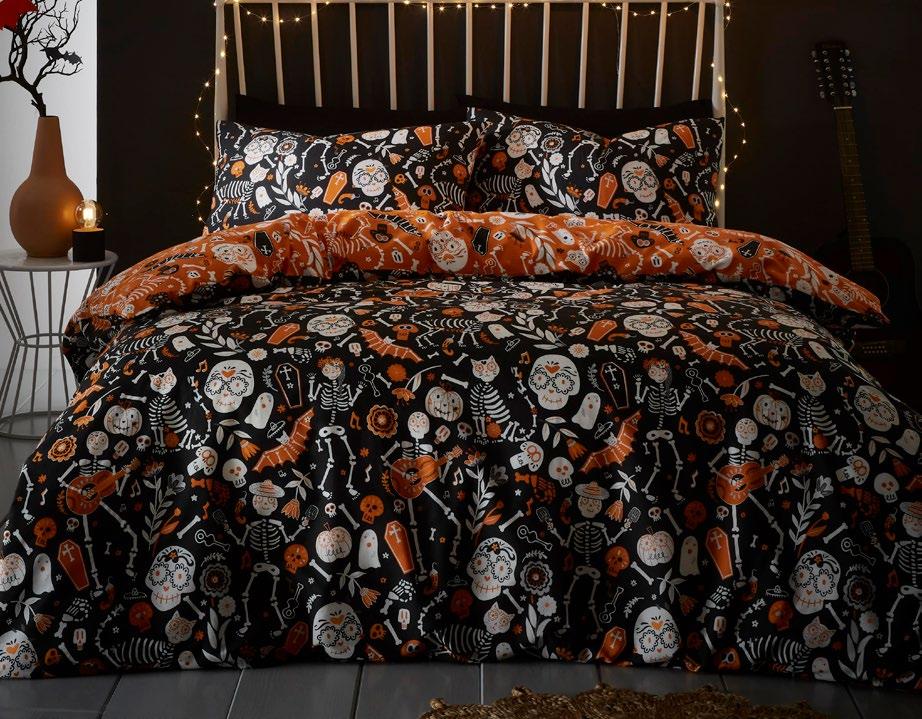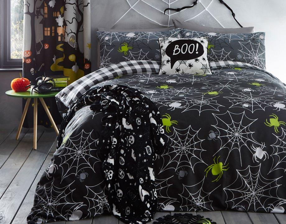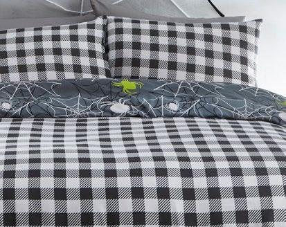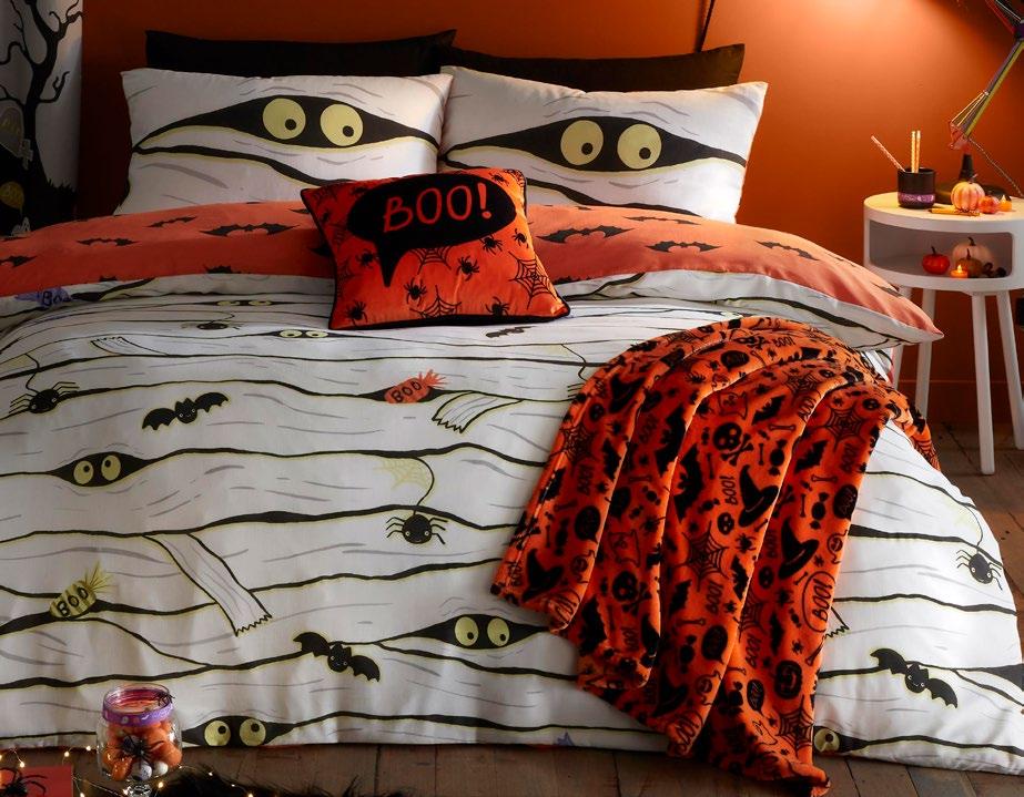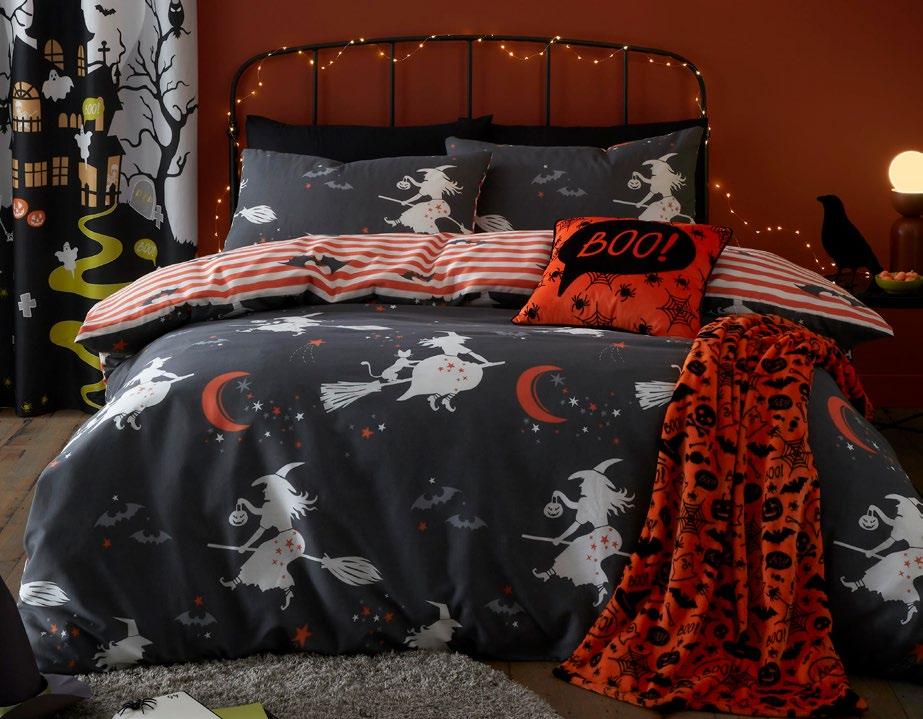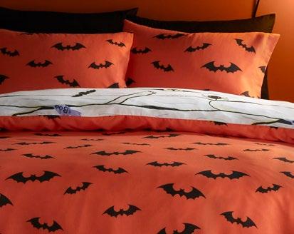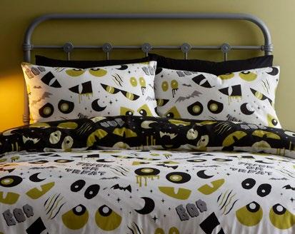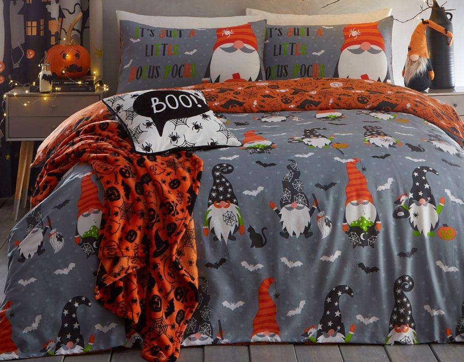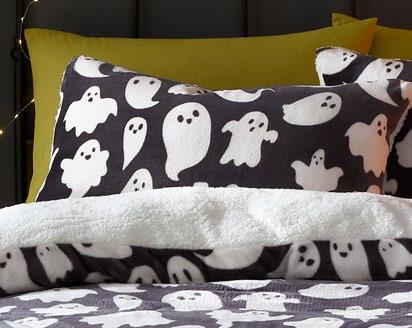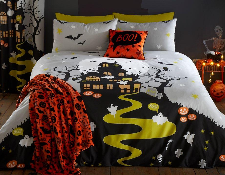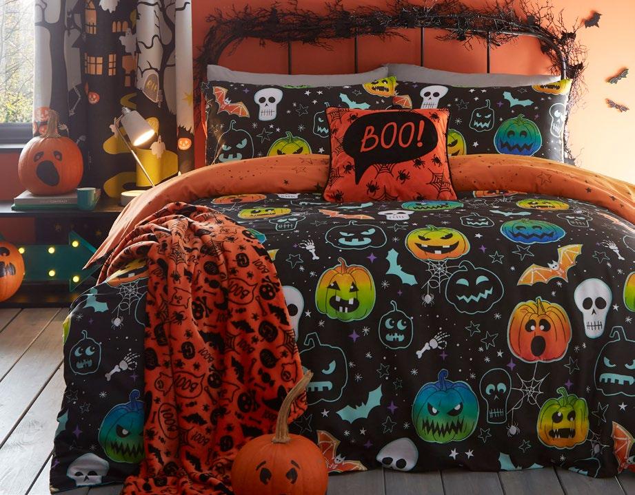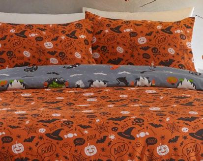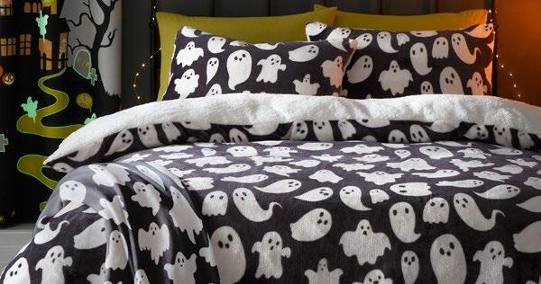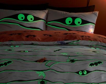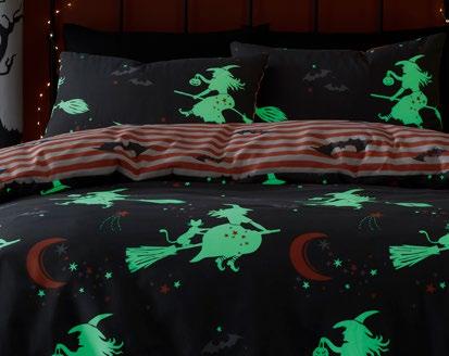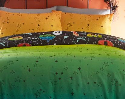 Feel the magic of the season with this ghoulishly delightful duvet set, Halloweeninspired gonks on the front and a whimsical pattern of bats, pumpkins, and ghosts on the reverse. Made from easy care, soft touch microfibre, ensuring a comfortable and snuggly night’s sleep. This bewitching duvet set glows in the dark!