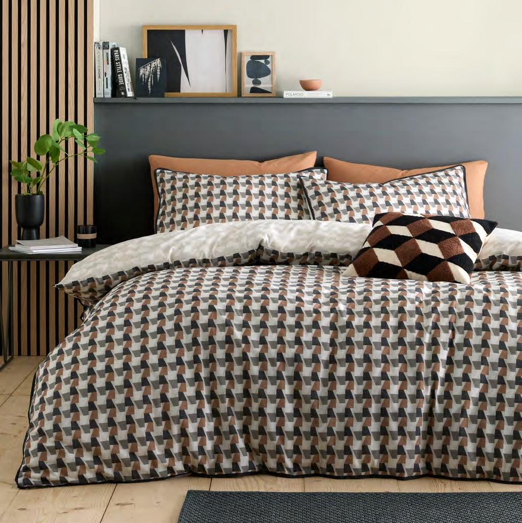 The Jett bedding from Appletree adds a striking, contemporary touch to slow mornings and relaxed evenings. Featuring a bold geo print with warm accents, complemented by black contrast piping, this 100% cotton set brings modern style and comfort to any bedroom.