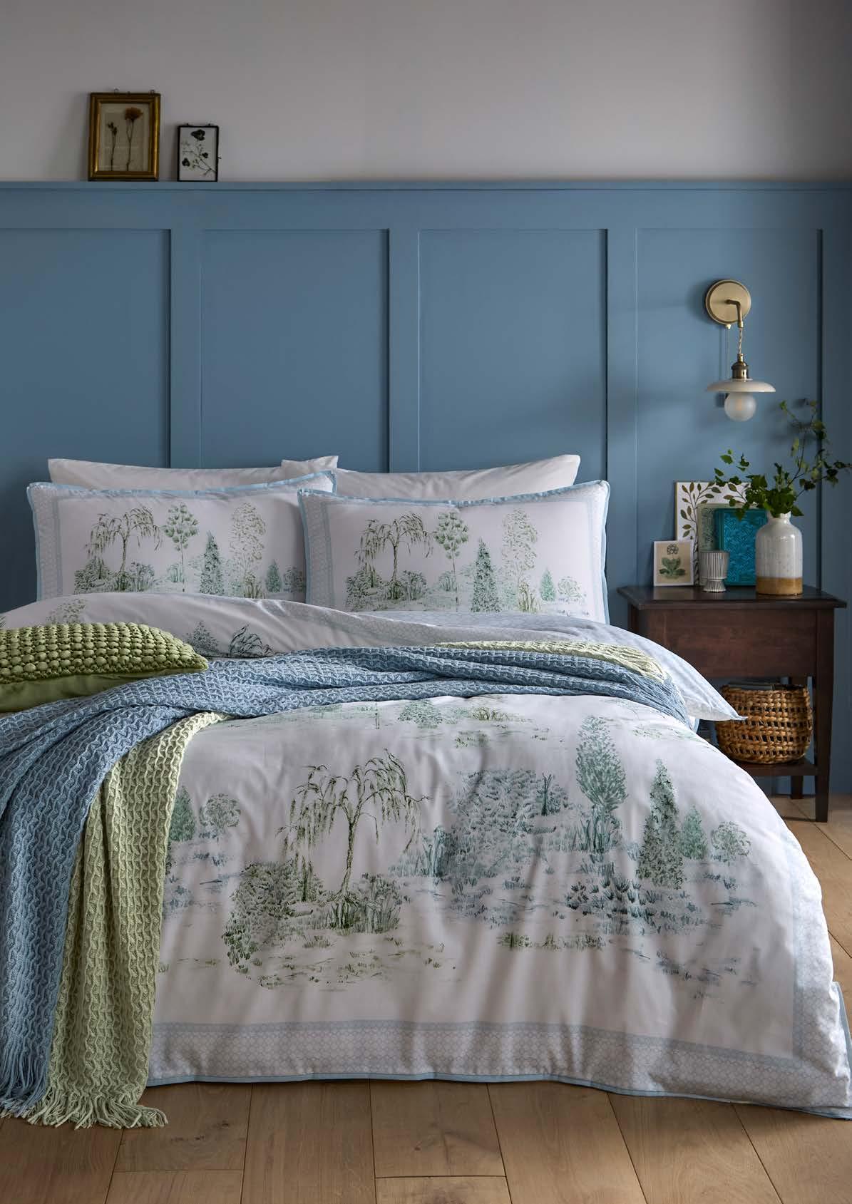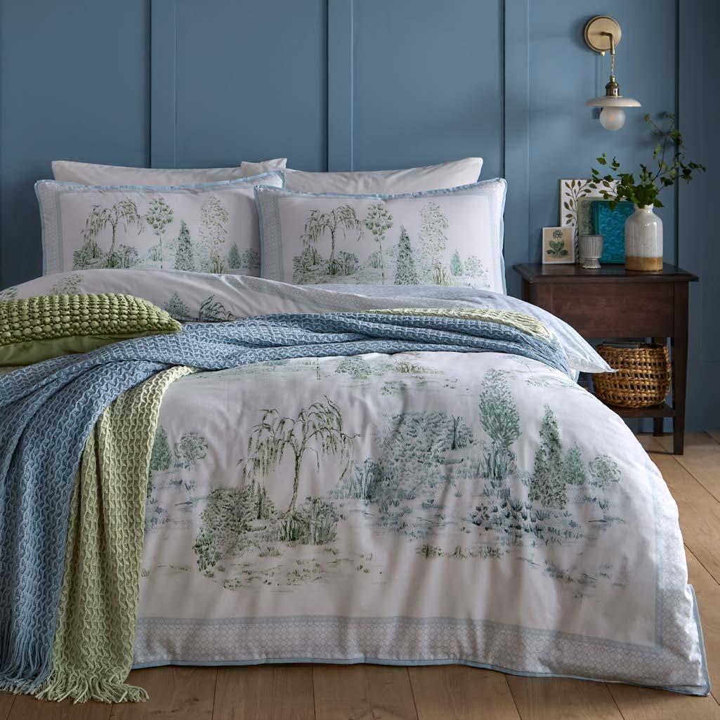 Transform your space with the Willow Tree Scene duvet cover set. Featuring a refined tranquil countryside toile in soft blues and sage, framed by a geometric border on silky 100% cotton sateen. The reverse reveals a subtle powder-blue trellis print –two elegant looks, effortlessly interchangeable for your modern sanctuary.