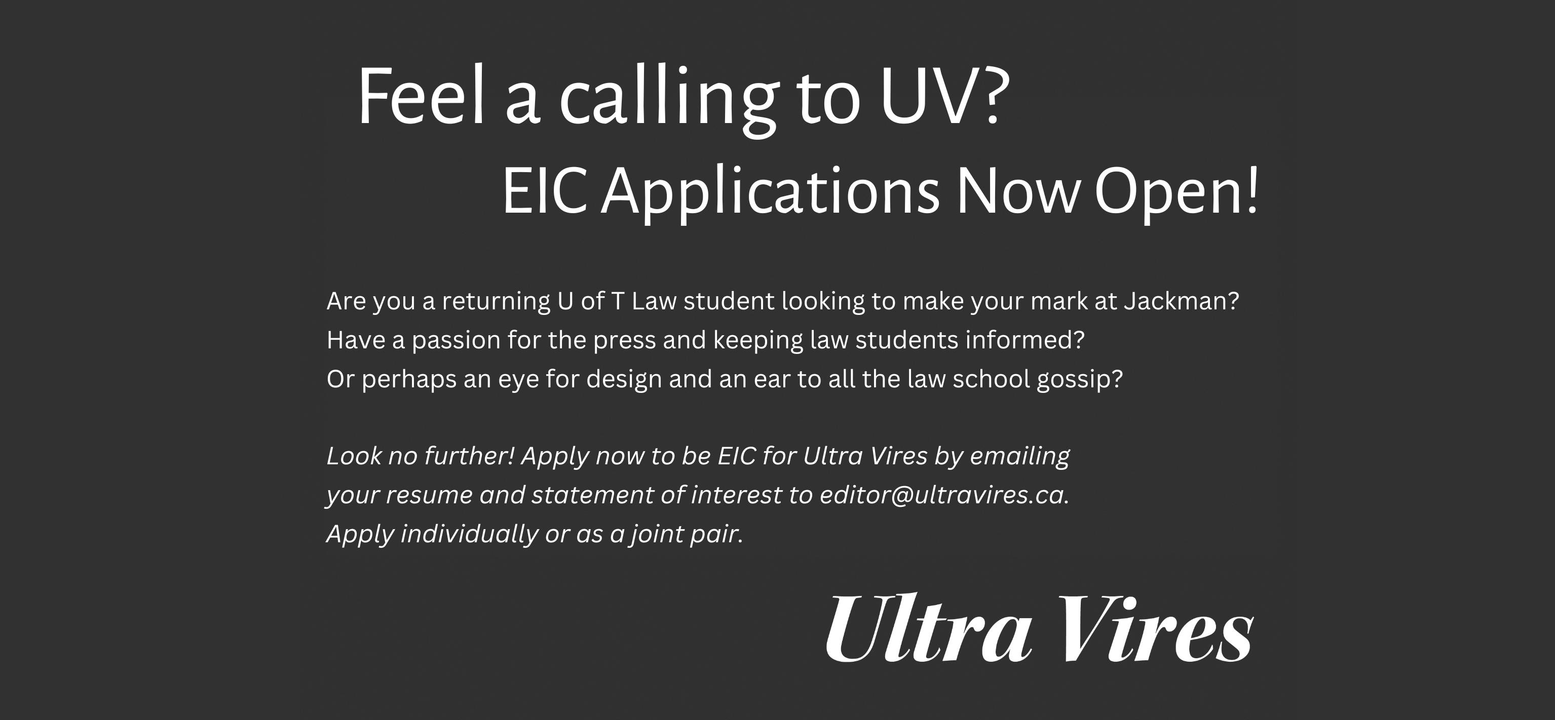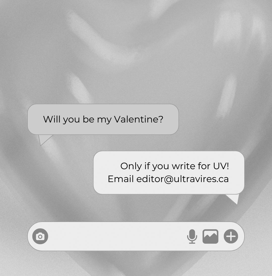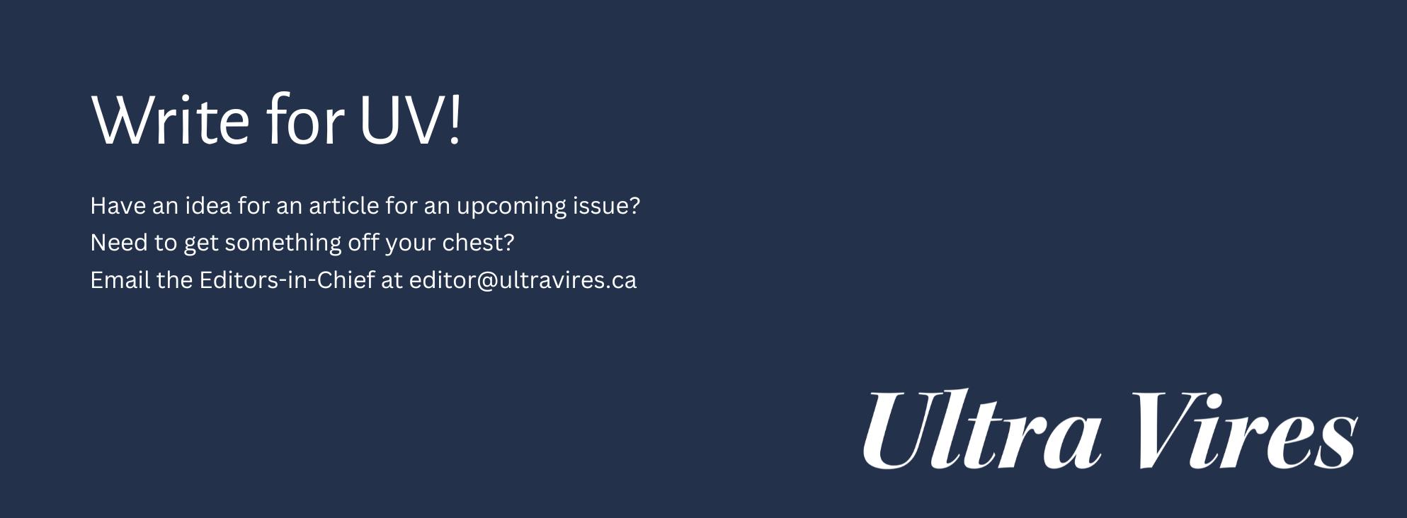 As always, if you have any comments, are looking for ways to get involved with UV, or just want to say hi, you can always reach us at editor@ultravires.ca or @ultravires.ca on Instagram.