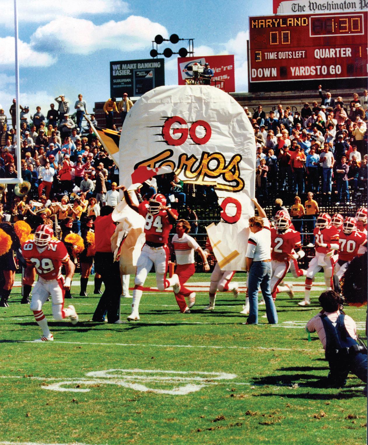 Wide receiver Russell Davis ’84 sprints through a script “Go Terps” sign in this c. 1982-83 photo. The wildly popular “Script Terps” football uniform, introduced in 1982, returns full-time this fall ahead of the 100th anniversary of Homecoming. (Coach Michael Locksley brought it back starting in 2019 for one game a year.) Get tickets for the 2023 season at umterps.com
