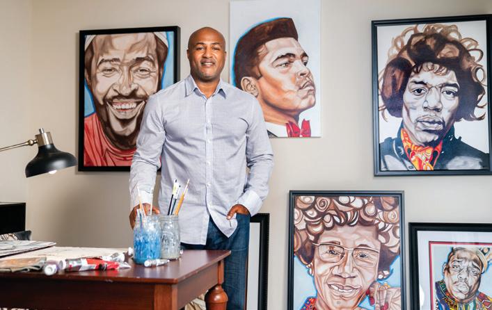 Sports are his core subject, but he paints African American leaders, musicians, actors—all life-size or bigger and rendered in oil paints. He even does pet portraits. “I’d rather paint only stuff that excites me, but business is another thing,” says Washington, who lives in Southern Maryland with his wife and twin daughters. “I don’t turn down commissions.”