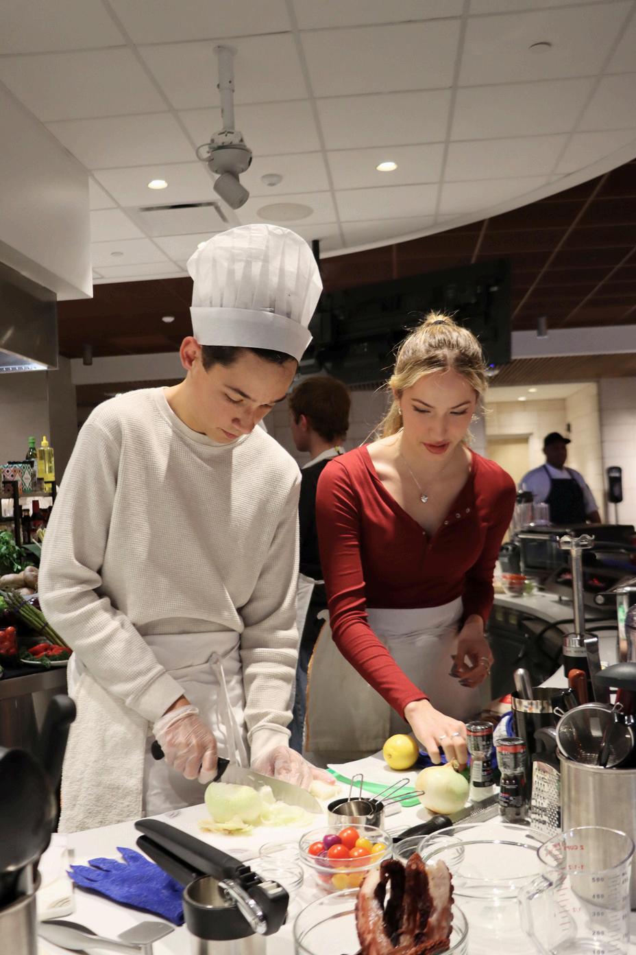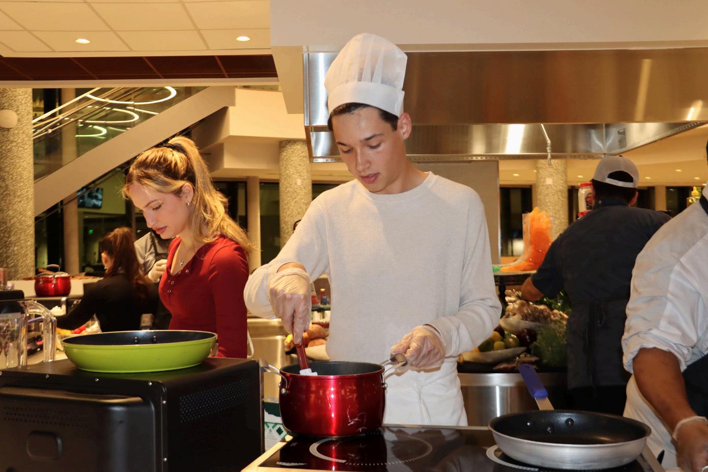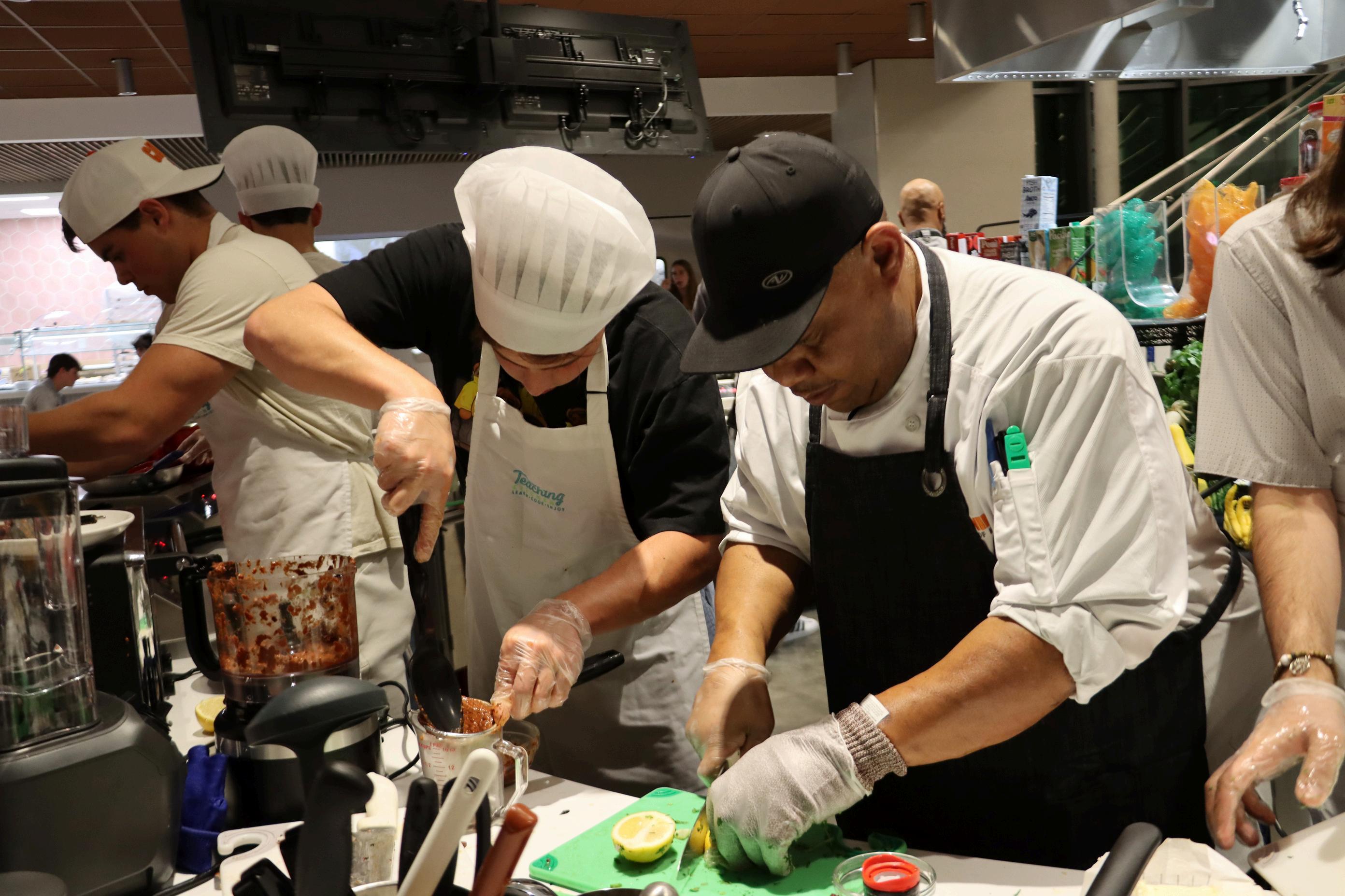 Centennial Village Dining Hall’s ambiance on the day of the event felt like stepping onto the set of Iron Chef. Each team of three had their own station, prepped with everything they might need to prepare their desired dish, from high-quality ingredients to professional-grade tools. Student participants were provided with aprons and hats to even further immerse themselves in the moment. With the competition’s fast-paced nature, its twists and turns and its professional setup, it truly felt like a scene out of Food Network.
