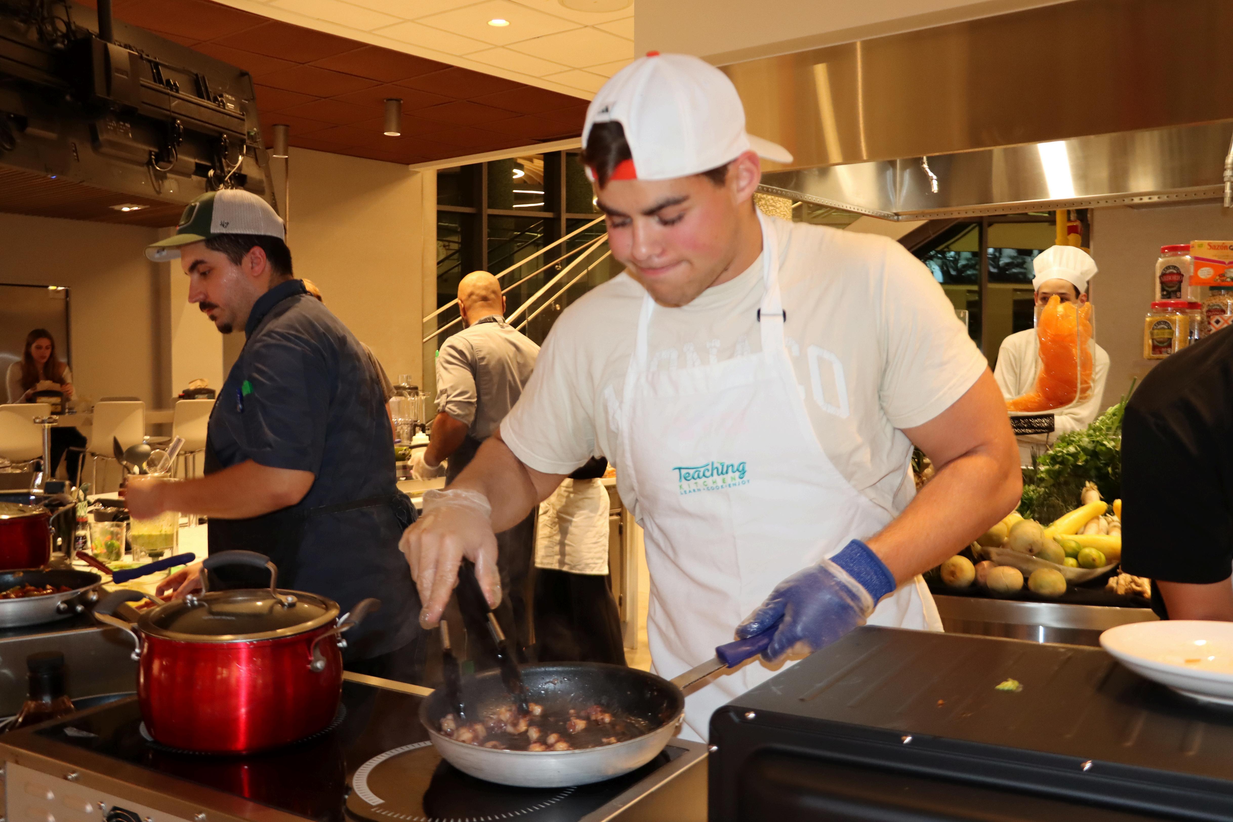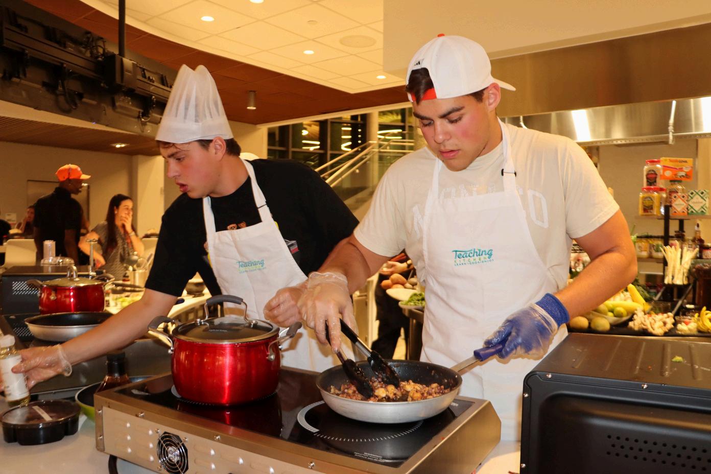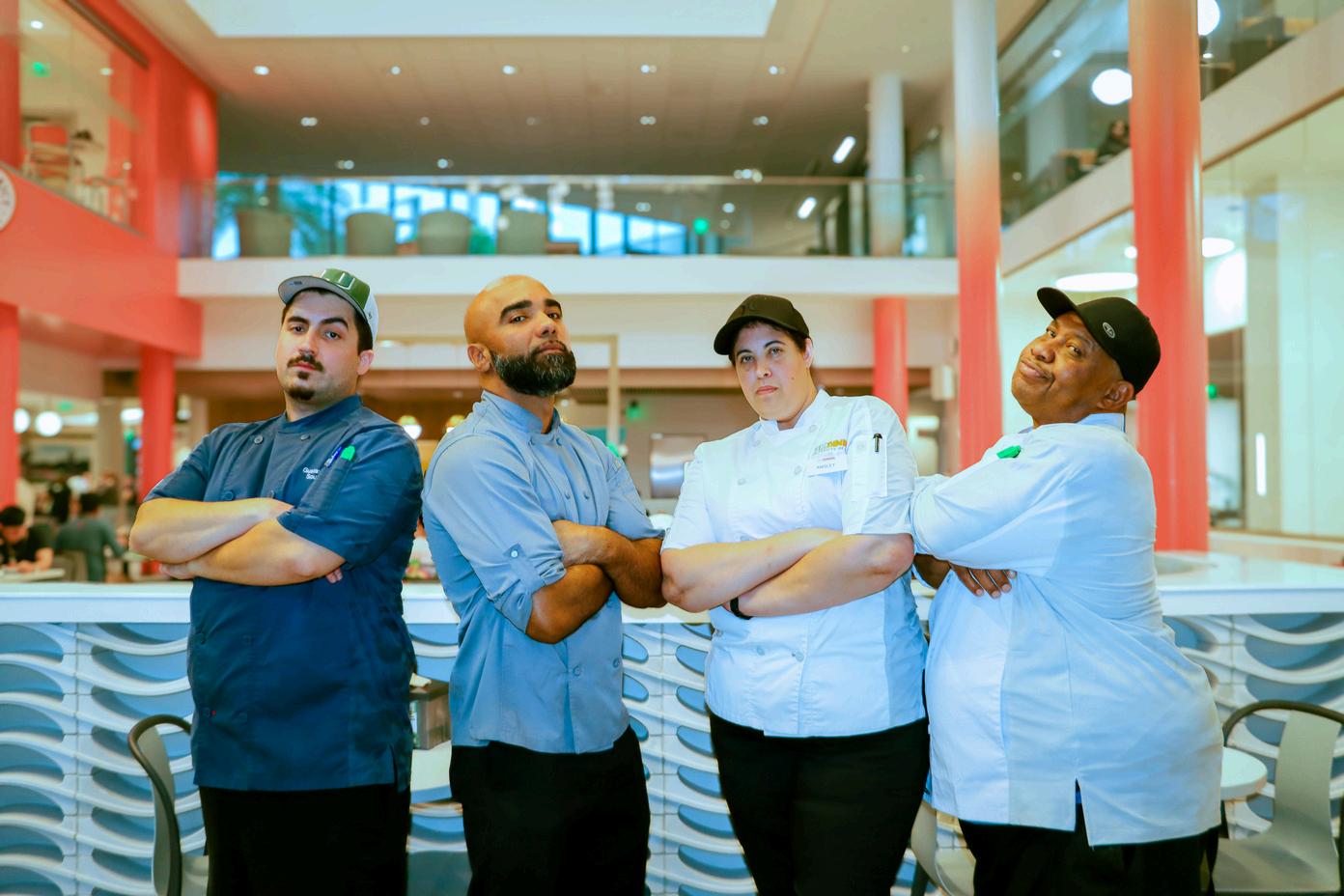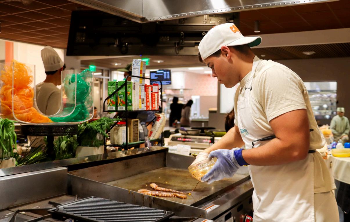 Centennial Village Dining Hall’s ambiance on the day of the event felt like stepping onto the set of Iron Chef. Each team of three had their own station, prepped with everything they might need to prepare their desired dish, from high-quality ingredients to professional-grade tools. Student participants were provided with aprons and hats to even further immerse themselves in the moment. With the competition’s fast-paced nature, its twists and turns and its professional setup, it truly felt like a scene out of Food Network.
