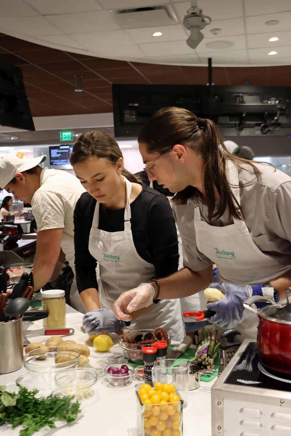 The competition took place in Centennial Village Dining Hall’s immersive teaching kitchen. This space is specifically designed for providing students and guests with a culinary experience like no other, where they can step into the kitchen and bring dishes to life. The kitchen fosters an atmosphere of learning, with anticipation filling the air as teams move swiftly to craft the perfect dish.