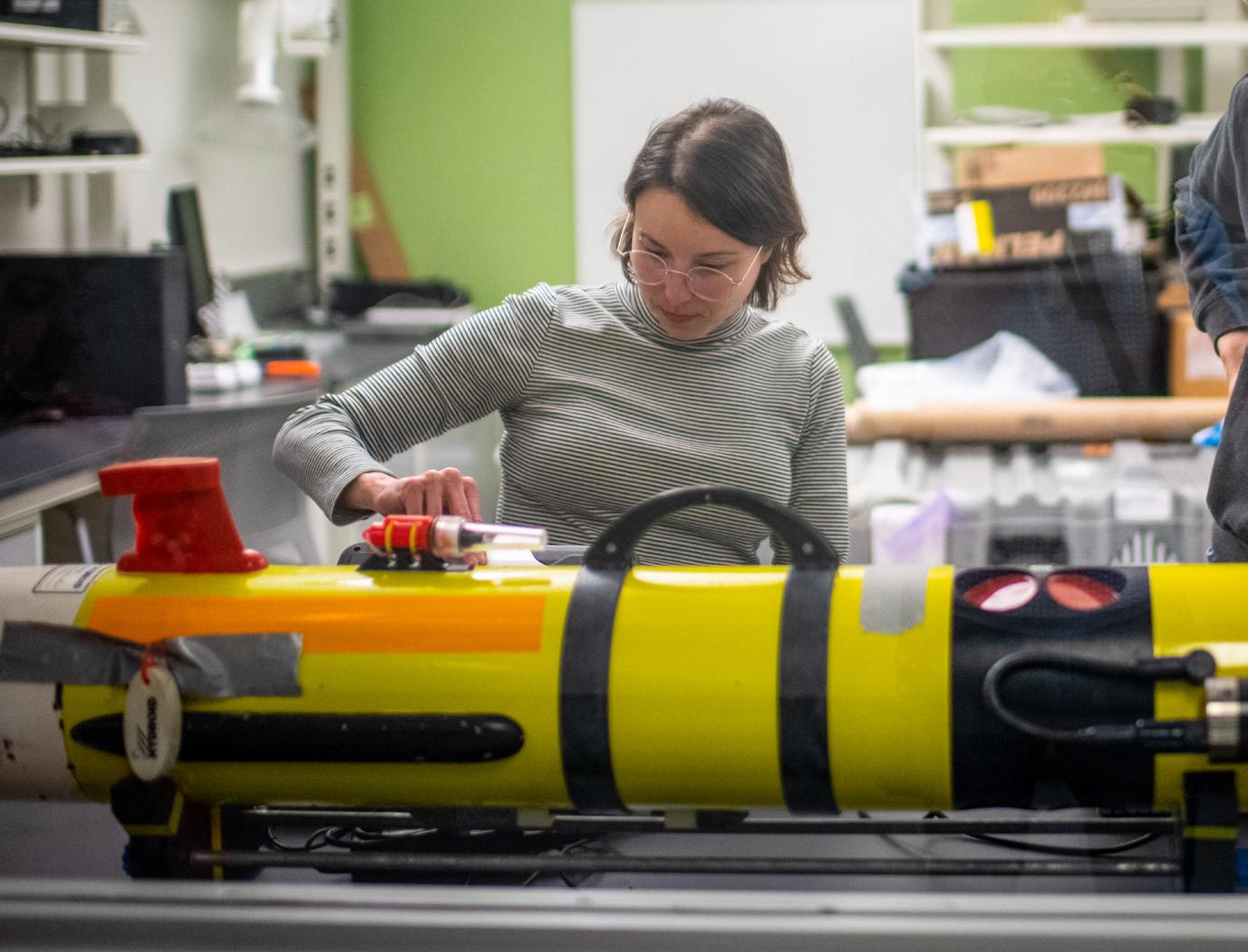PhD student Agata Piffer Braga '24 working on an autonomous underwater vehicle (AUV) at SMAST.