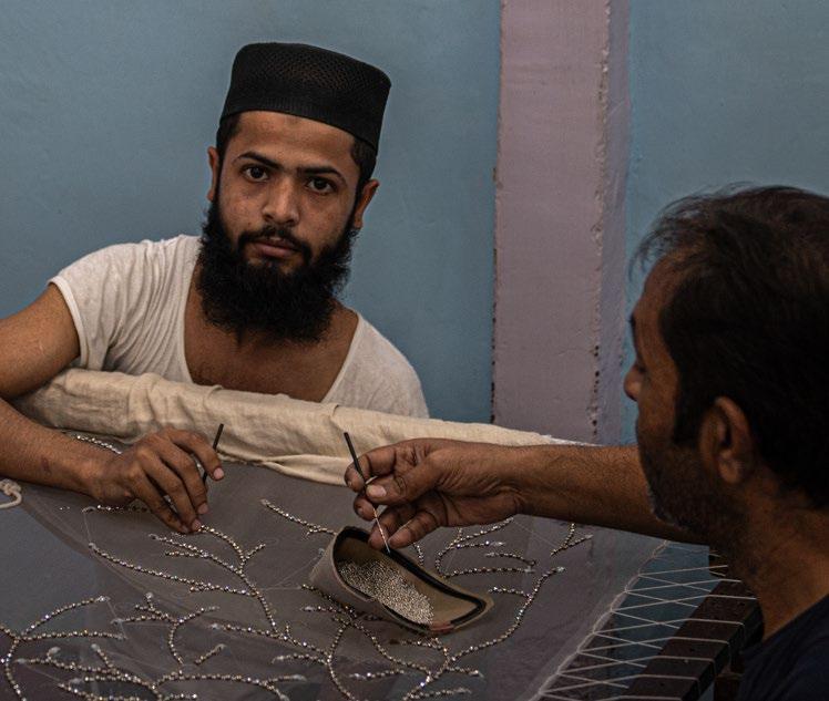 In a modest workshop tucked into a narrow lane of Chandni Chowk, we photographed a group of zardozi karigars, sitting cross-legged, quietly embroidering sheer veils with gold and silver threads. Bent over wooden frames, their fingers stitched paisleys, vines, and floral motifs onto thin, shimmering fabrics. After hours of meticulous labor, the fabrics they craft are eventually transformed into glamorous gowns to be walked down a distant runway in a fashion show.