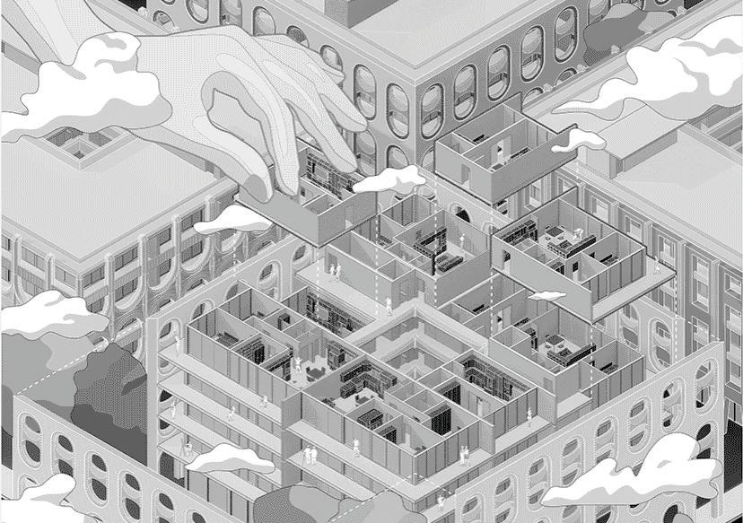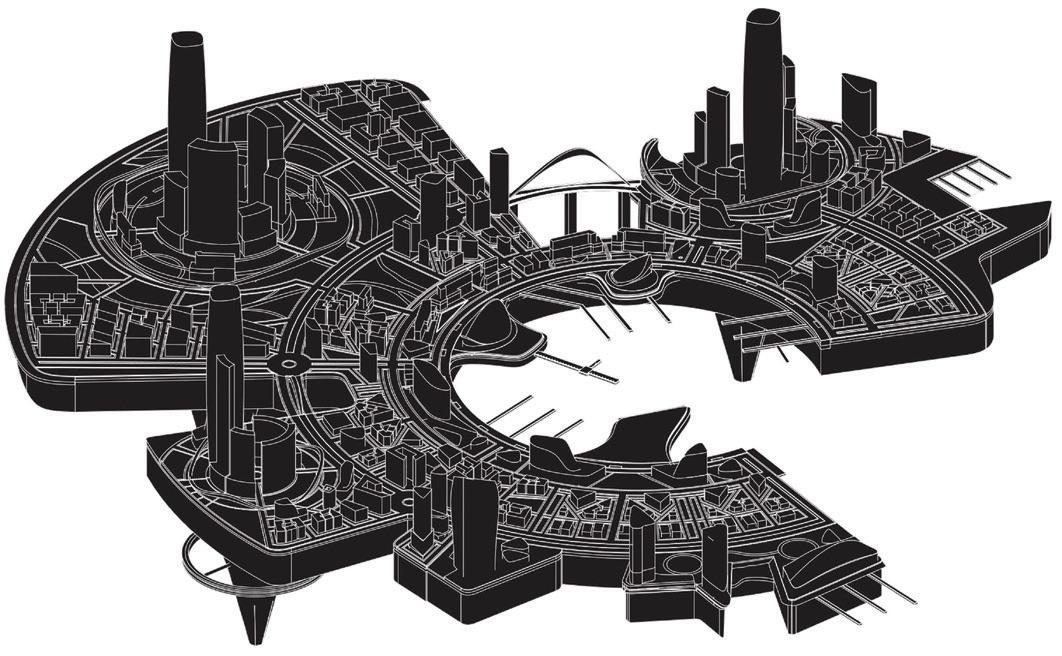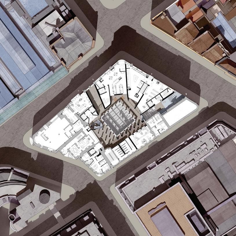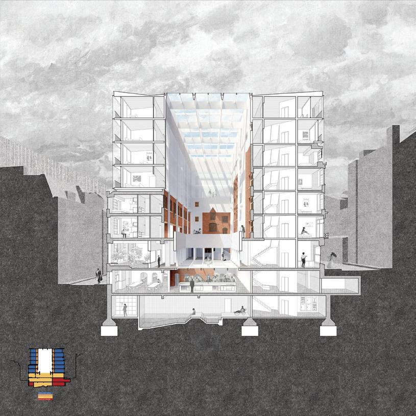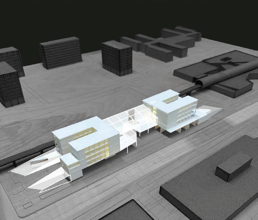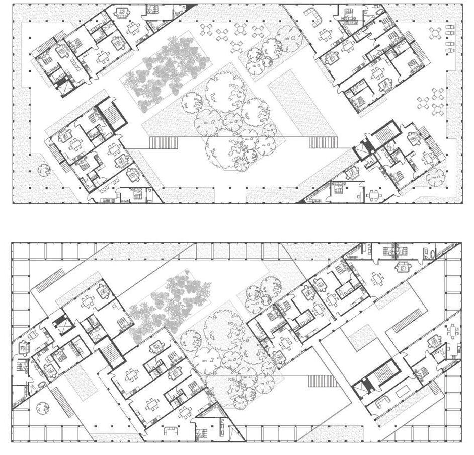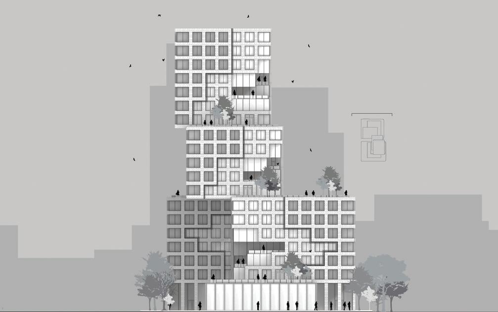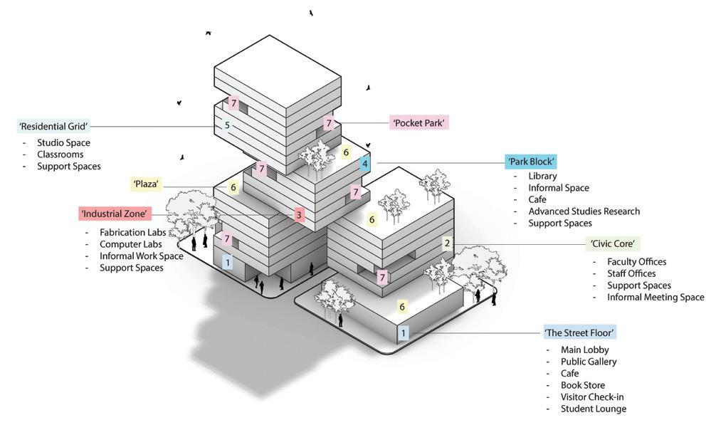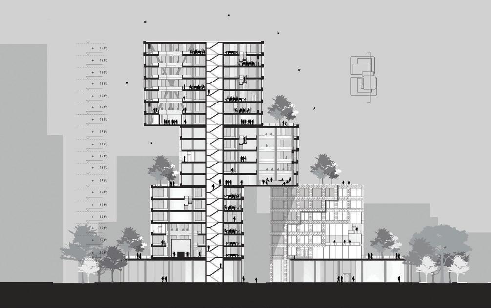rationalist high-rise — defined by rectilinear, stacked floor plates — by using the urbanistic metaphor to organize diverse programmatic components into distinct “programmatic neighborhoods,” creating a vertical campus that fosters richer spatial, social, and educational experiences within the tower form.