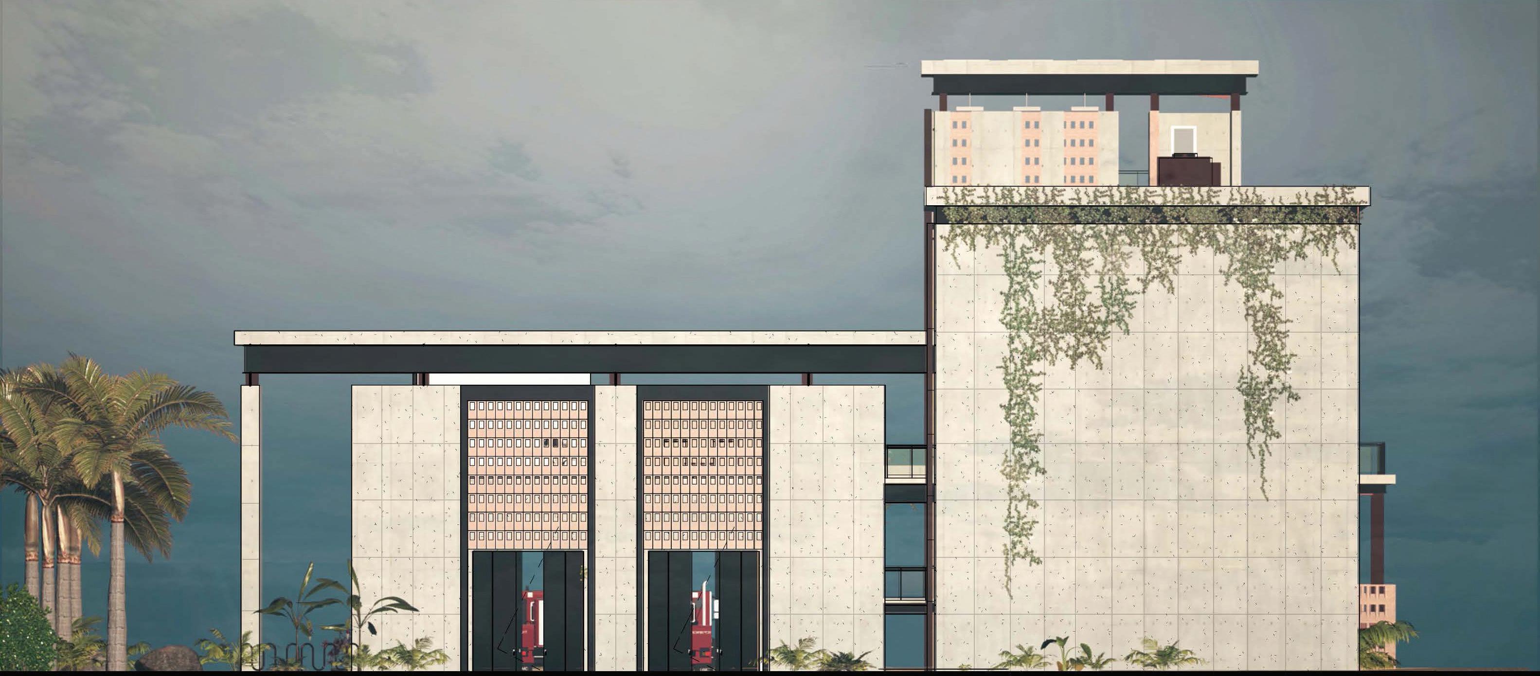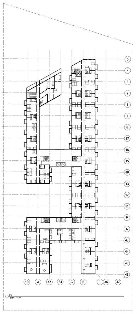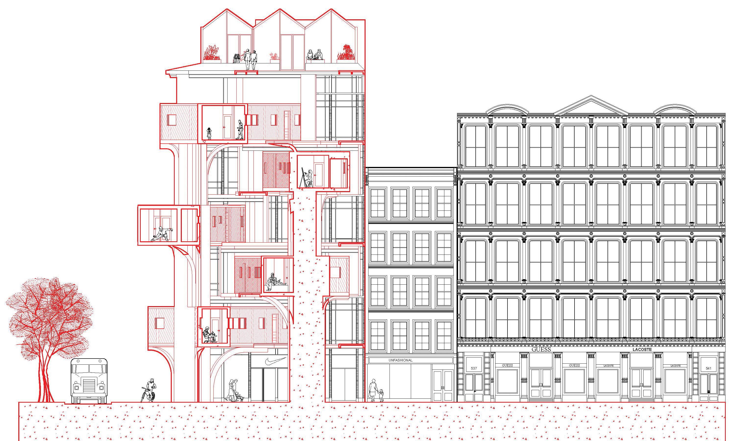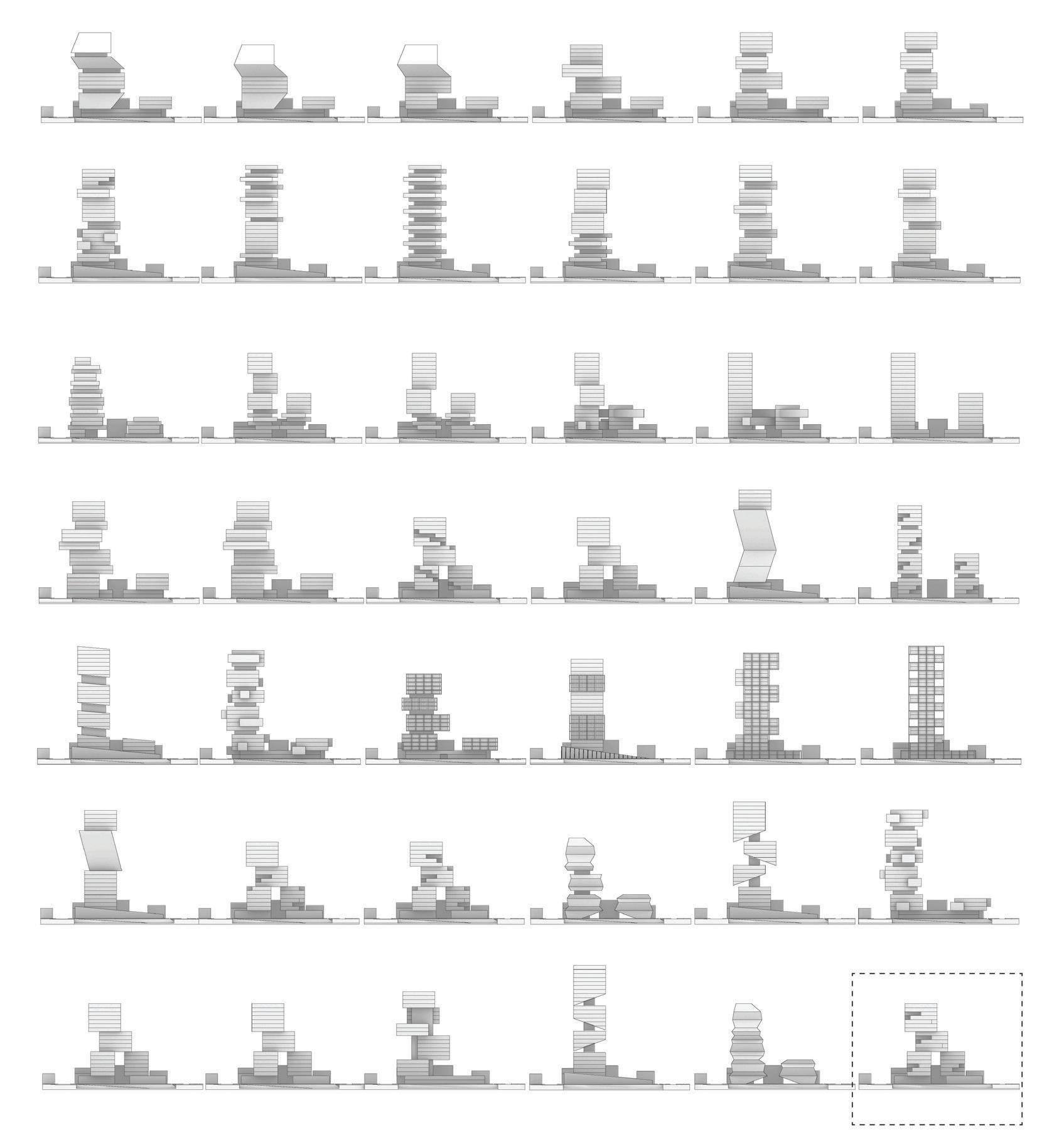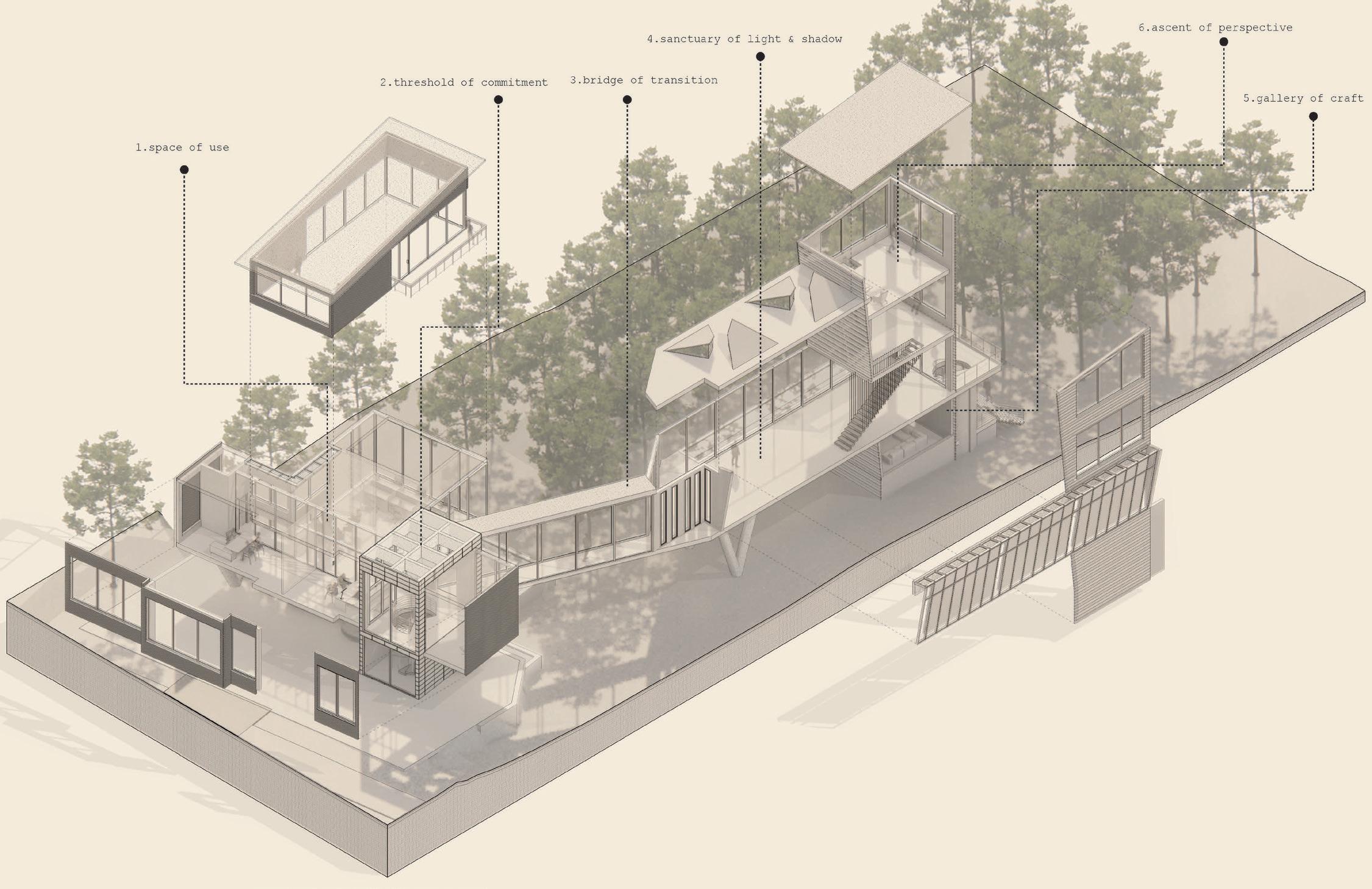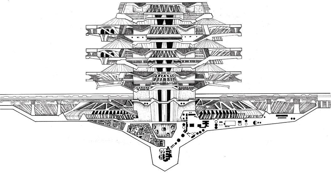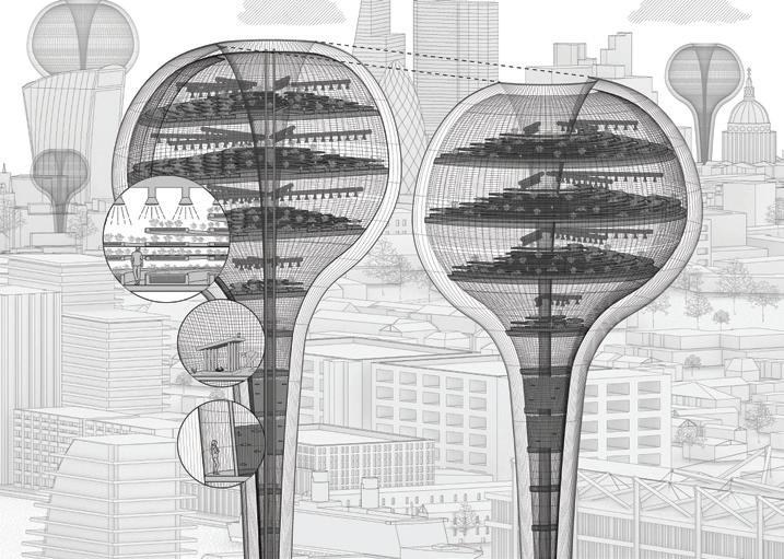 rationalist high-rise — defined by rectilinear, stacked floor plates — by using the urbanistic metaphor to organize diverse programmatic components into distinct “programmatic neighborhoods,” creating a vertical campus that fosters richer spatial, social, and educational experiences within the tower form.