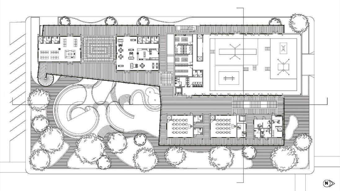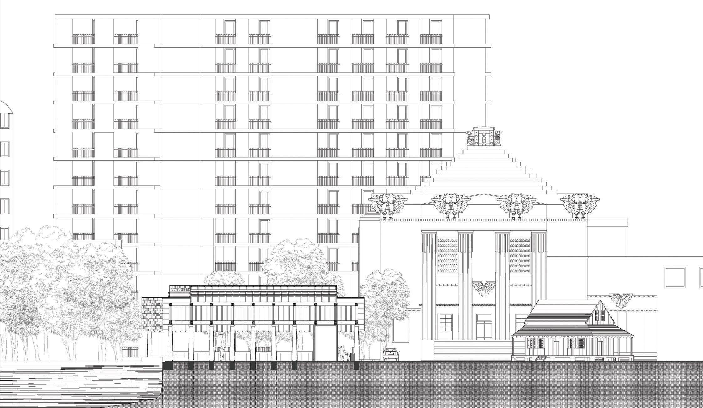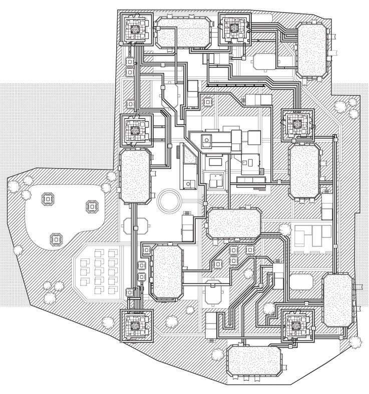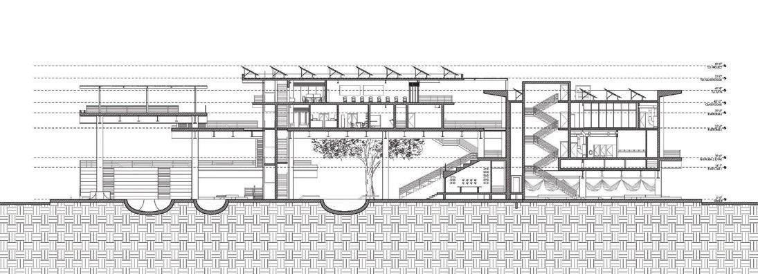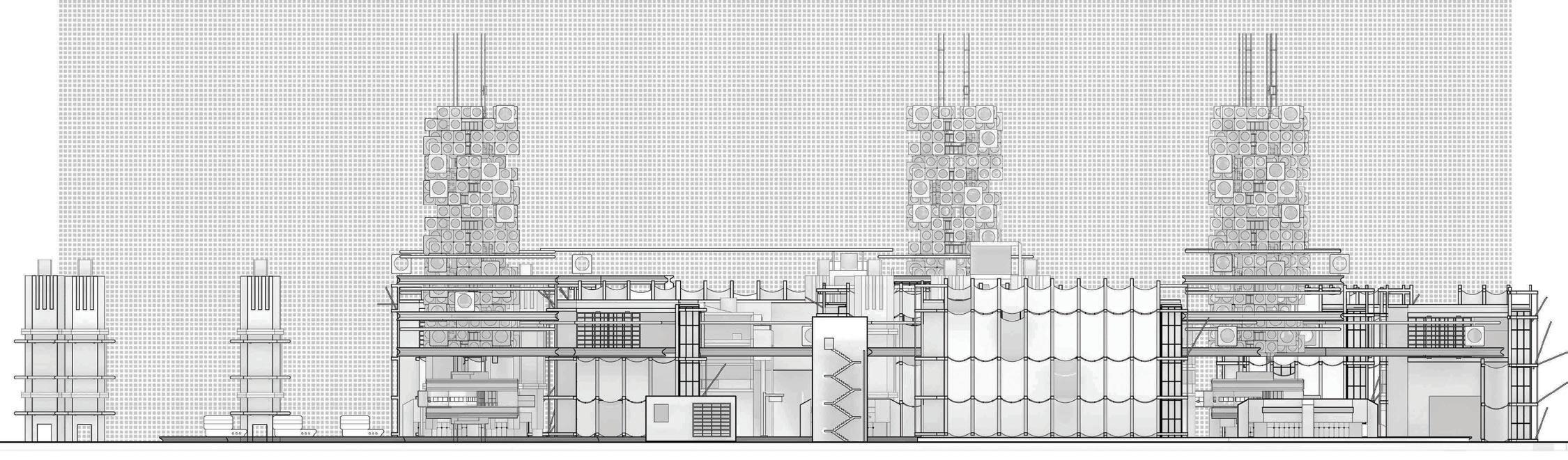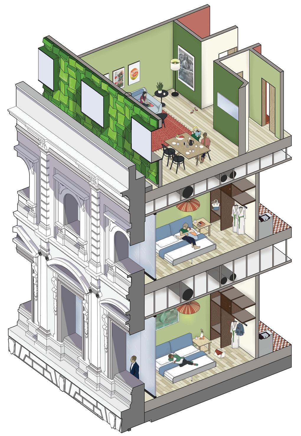 rationalist high-rise — defined by rectilinear, stacked floor plates — by using the urbanistic metaphor to organize diverse programmatic components into distinct “programmatic neighborhoods,” creating a vertical campus that fosters richer spatial, social, and educational experiences within the tower form.