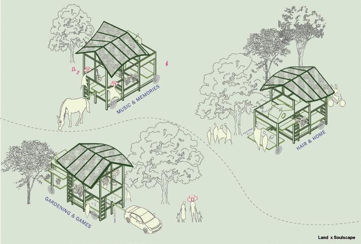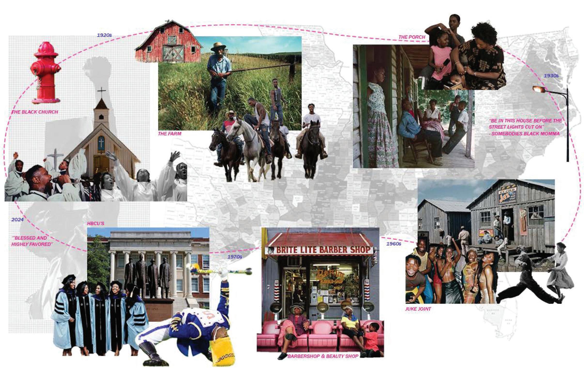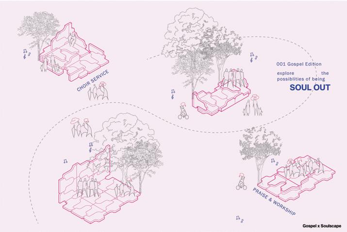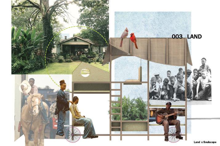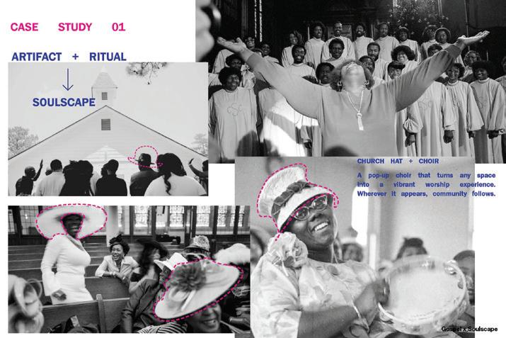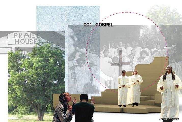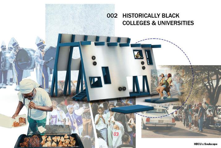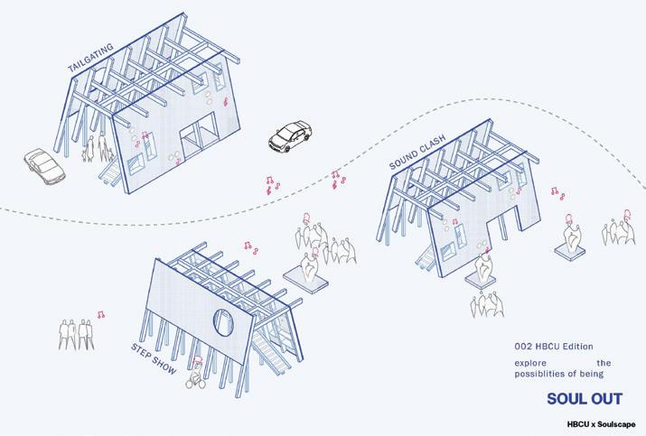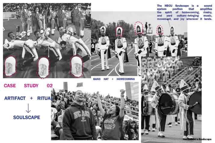 Soulscapes explores how architecture can hold space for both joy and relief in Southern Black communities—focusing on the church, the HBCU, and the land. These spaces, rich with memory, rhythm, and care, are where culture has long gathered and grown. Through a mix of research and design, I’ve created Soulscapes: a method built on familiar artifacts and collective rituals that have supported Black life for generations. Here, a church hat isn’t just fashion— it’s form. A band performance isn’t just sound—it’s structure. A front-yard gathering becomes a blueprint for belonging. This work doesn’t just observe—it joins in. It celebrates the past, vibes with the present, and makes room for the future. Soulscapes is design that sings, dances, remembers, and invites you in.