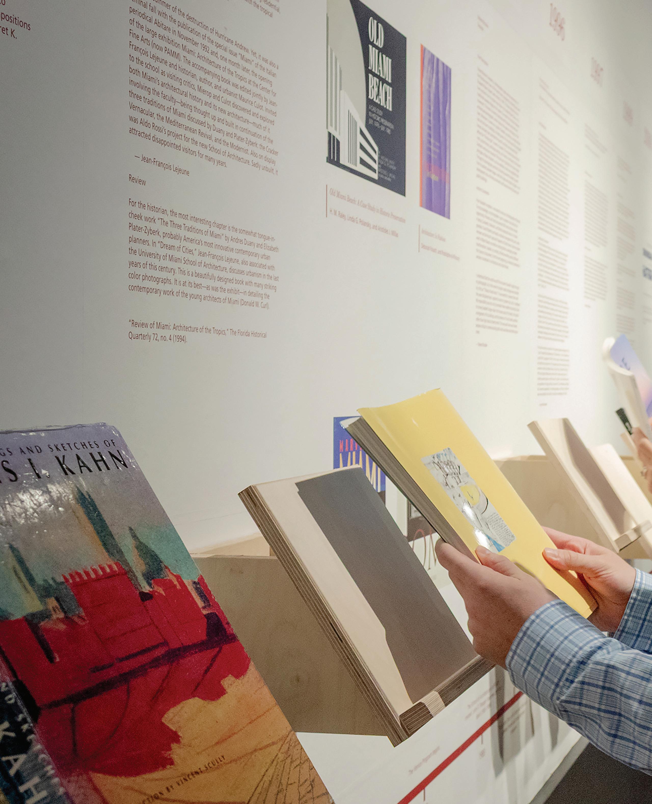 The exhibition features a history of professional, academic, and scholarly publications that have been produced by its faculty and alumni since its founding in 1927. Throughout its history, the University has contributed to the discipline of architecture by having its faculty engage in both professional practice and scholarly research. To that end, the Exhibition of Faculty and Alumni Publications allowed us to present for the first time a visual display of published book covers in chronological order alongside the major developments and events at the school over its first centenary. Consisting of nearly 200 volumes, the exhibition covers a range of topics that include architecture, urban design, history and theory, landscape and the environment, art and design, with a considerable number having a distinct focus on South Florida. With selected volumes highlighted in greater detail, and many physical copies on view for perusing, the exhibition provides an interactive presentation of the oftensolitary practice of researching and writing.