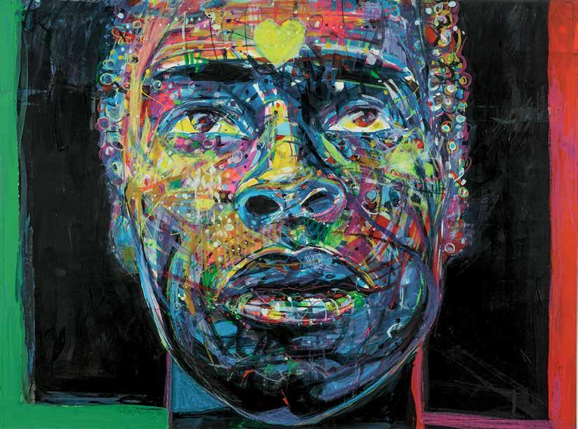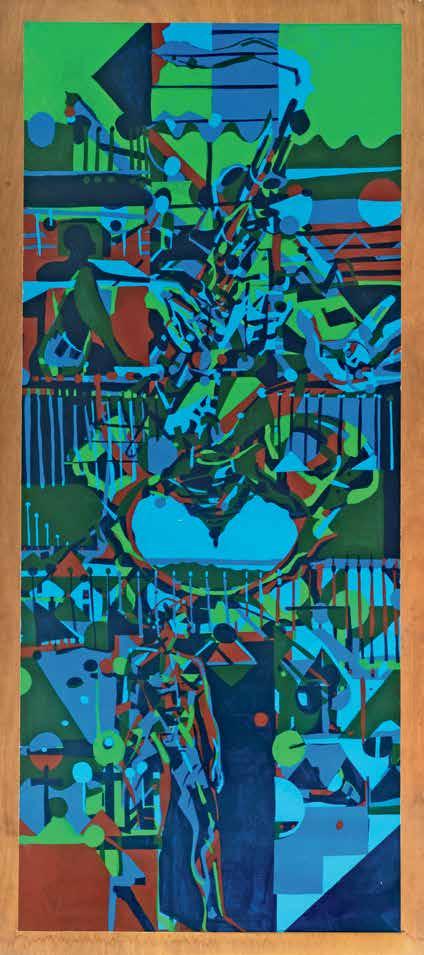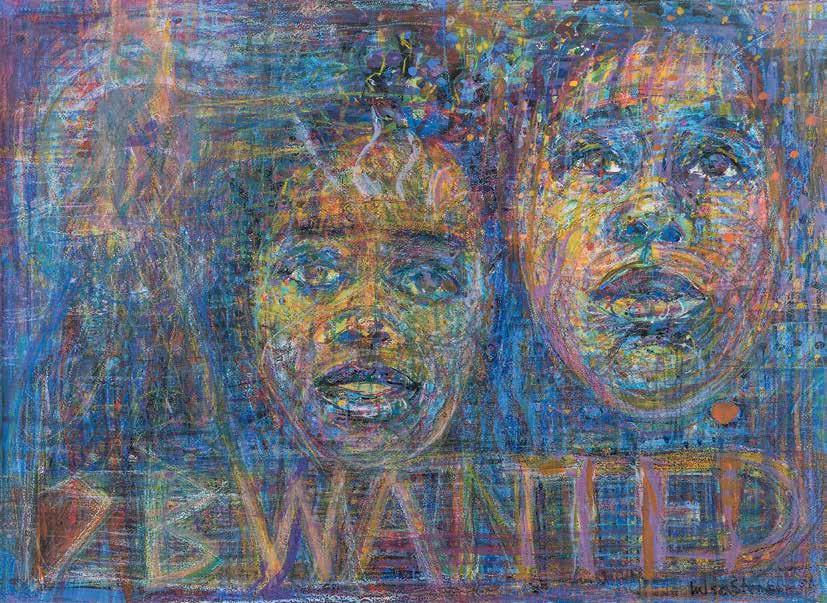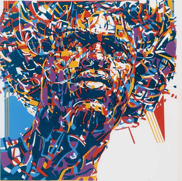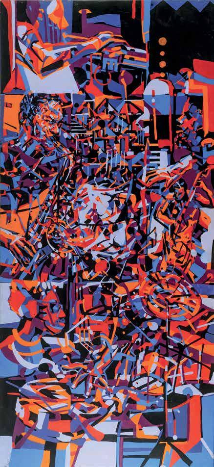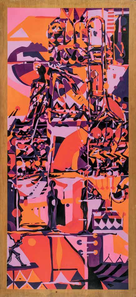 vivid, contrasting colors. His artistic vision created an indelible legacy of the visuality of Black Power aesthetics that illustrated ideals of empowerment and authority and celebrated the distinctiveness of African American humanity, identity, culture, and endless heroic achievements. His figurative works shined critical lights on how to more appropriately portray and represent human beings of African descent in ways that went far beyond the aesthetics of the Harlem Renaissance/New Negro era of the 1930s and 1940s. His compositions are filled with bright, saturated colors; vibrating patterns; and cursive markings. The subjects depicted are famous individuals and unknown people from the community, heroes whose bodies are projected into a realm of Afro-futuristic and otherworldly realities, inspired by America’s space explorations and the popularity of the 1966 future-forward Star Trek sci-fi series set in the 23rd century.