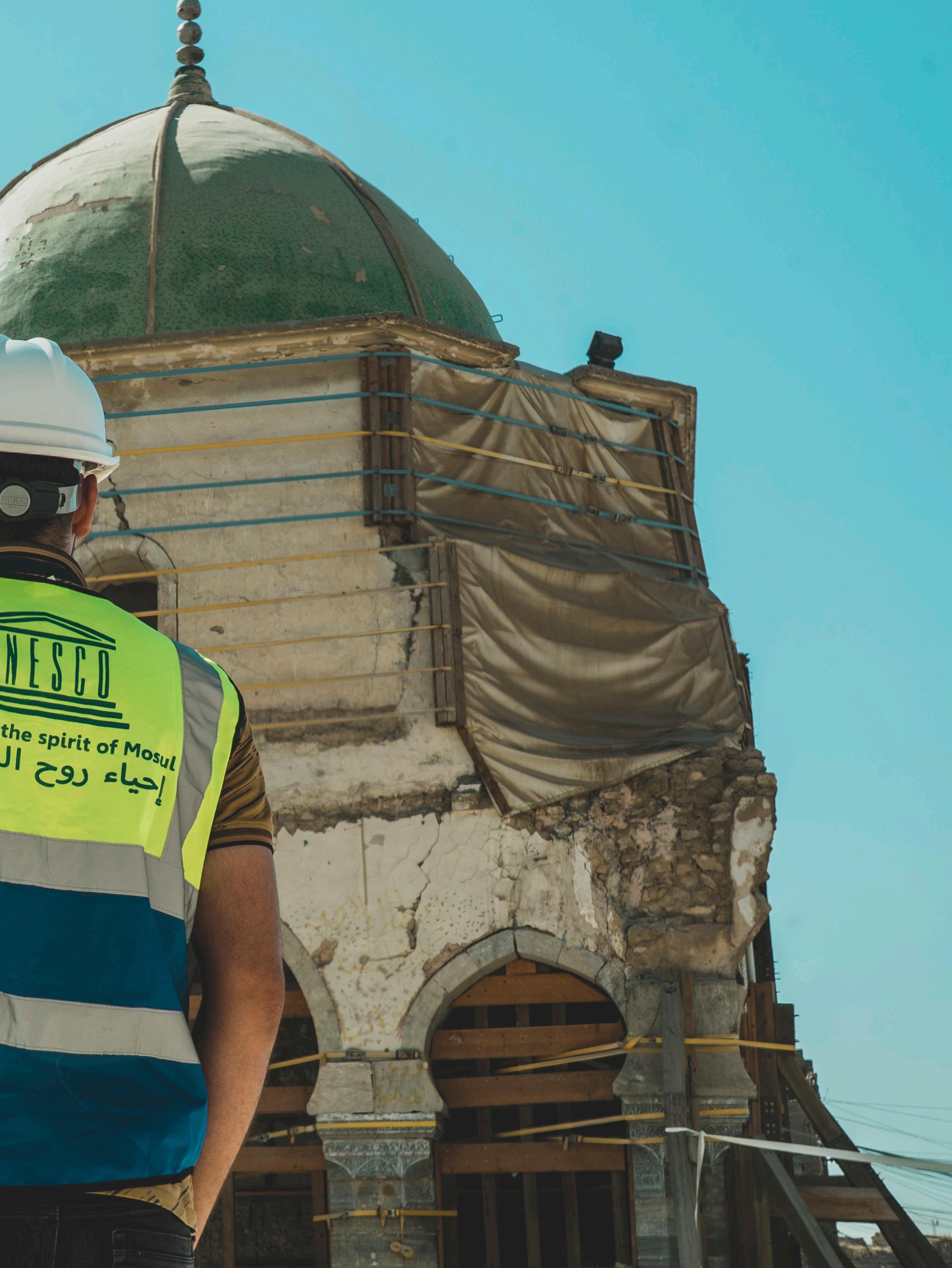 5커버스토리UNESCO News vol.796 © UNESCO 2014년부터 약 3년간 이슬람 극단주의 무장단체인 이라크 레반트 이슬람국(ISIL)의 점령하에 수많은 유 무형의 문화유산이 파괴된 이라크의 역사도시 모술(Mosul)의 알 노우리(Al Nouri) 모스크의 재건 현장 유네스코는 2018년부터 ‘모술의 정신 재건’(Reviving the Spirit of Mosul)사업을 진행하며 이곳에서 유산 복원과 교육 및 지역 재건사업을 펼치고 있다