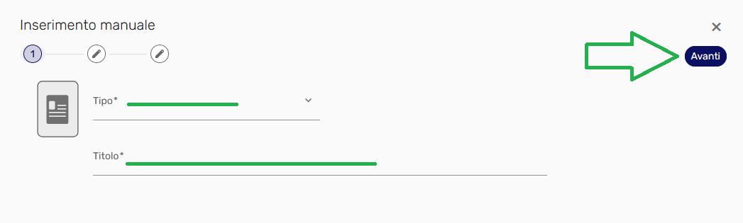 2. Selezione il tipo di materiale (Libro, articolo, e-book…), compilare il titolo della risorsa e cliccare su Avanti