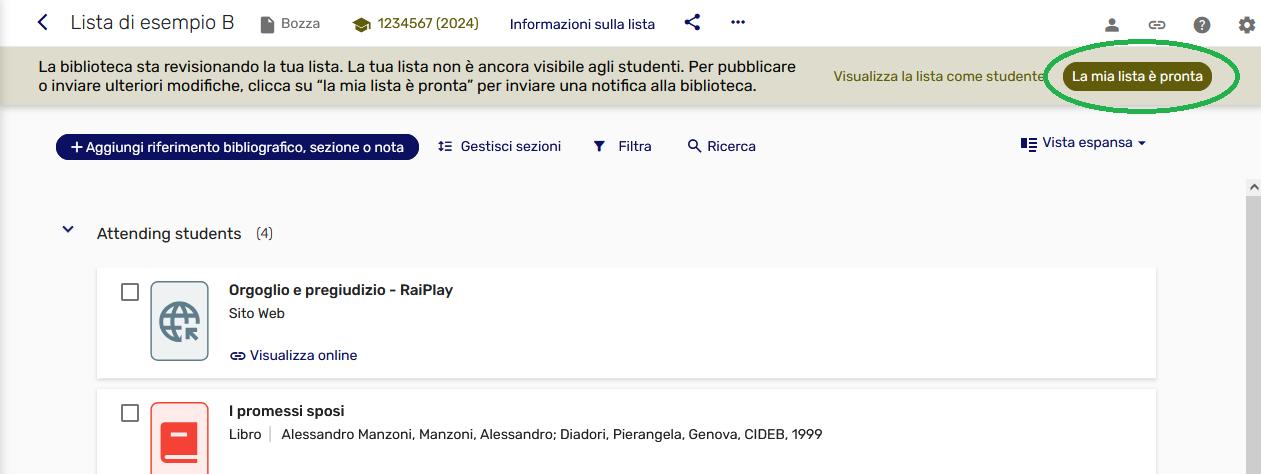 Tutte le Liste restano in stato di bozza finché non sono inviate alla Biblioteca per la verifica dei loro contenuti e la loro pubblicazione