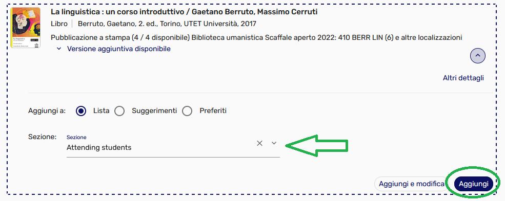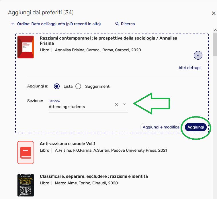 2. Individuare il titolo e selezionare la sezione in cui si intende inserirlo. Cliccare su Aggiungi:
