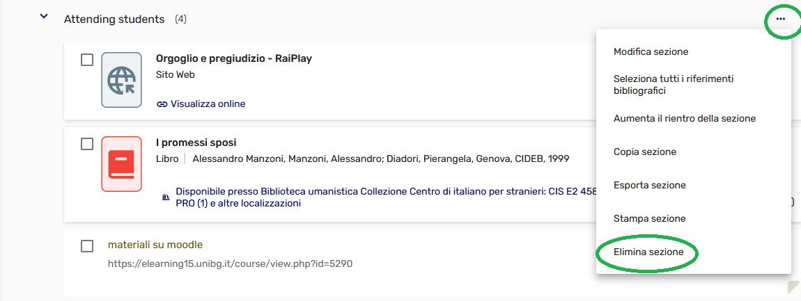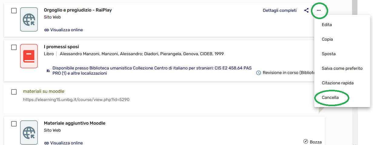 1. Per eliminare un riferimento bibliografico, cliccare sul menu tre puntini in corrispondenza del titolo, quindi Cancella.