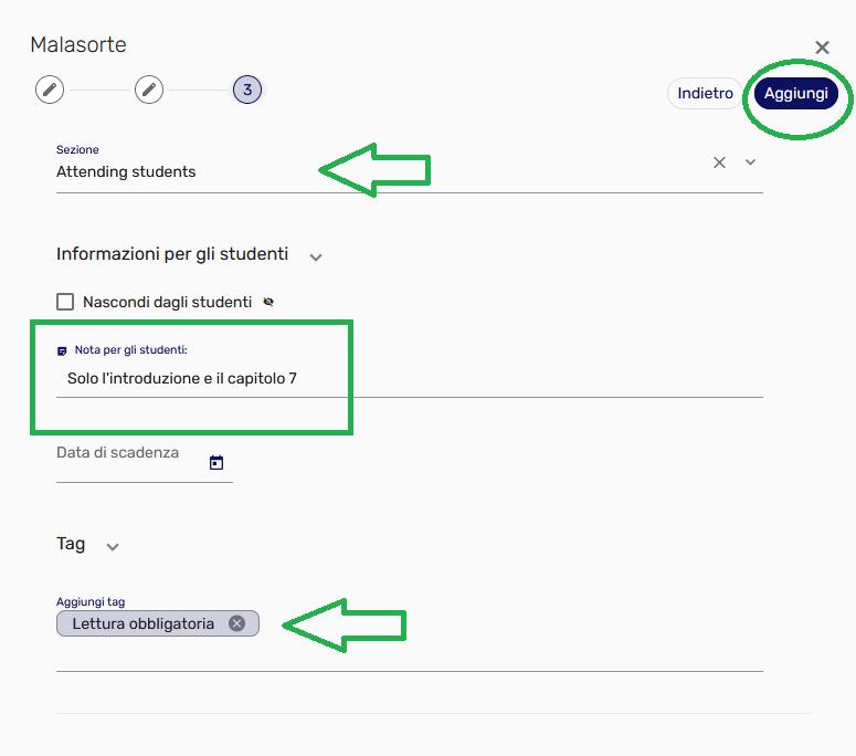 4. Selezionare la sezione in cui si vuole aggiungere il riferimento bibliografico e aggiungere eventuali indicazioni aggiuntive nel campo Nota pubblica. È possibile inoltre assegnare un tag (Es.: Lettura obbligatoria ). Il campo Data di scadenza NON DEVE essere compilato per le bibliografie d’esame. Cliccare su Aggiungi.