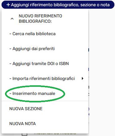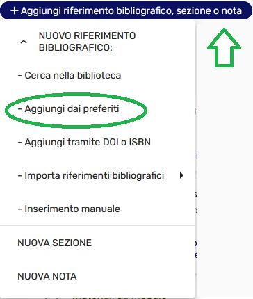 1. È possibile aggiungere riferimenti bibliografici da I miei preferiti. Cliccare su “Aggiungi riferimento bibliografico, sezione o nota”, quindi su NUOVO RIFERIMENTO BIBLIOGRAFICO: → Aggiungi dai preferiti