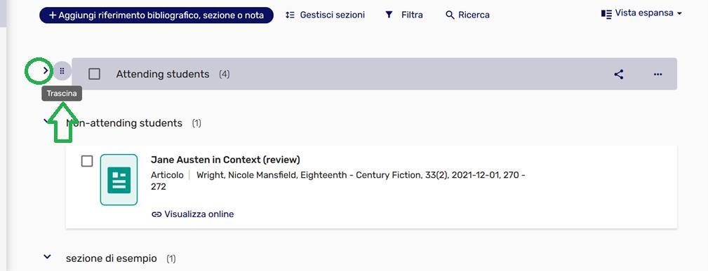Per posizionare in modo differente la sezione creata, comprimerla attraverso la freccetta a sinistra e trascinarla nella posizione desiderata.