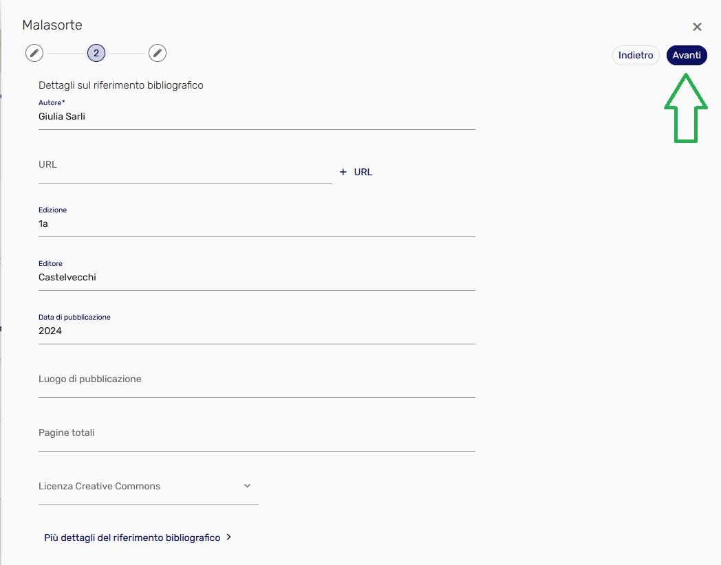 3. Indicare eventuali altri dati bibliografici (facoltativo). Queste informazioni aiutano le biblioteche a identificare correttamente la risorsa in caso di acquisto. Cliccare su Avanti