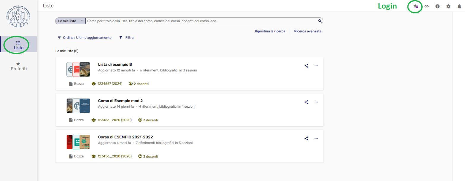 Per visualizzare le bibliografie, è necessario autenticarsi in Leganto e scegliere il menu Liste.