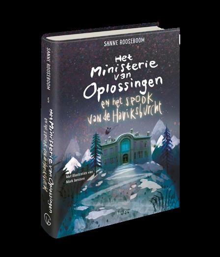 Het Ministerie van Oplossingen en het spook van de Haviksburcht | Sanne Rooseboom | Illustraties: Mark Janssen omslagontwerp: Mark Janssen en Marieke Oele | gebonden | 272 blz. | 14 x 21,5 cm | isbn 978 90 00 38506 5 nur 283 (Fictie 10-12 jaar) | isbn 978 90 00 38507 2 | € 9,99 Gevulde backcard | 6 exemplaren | isbn 978 90 00 38745 8 | € 95,94