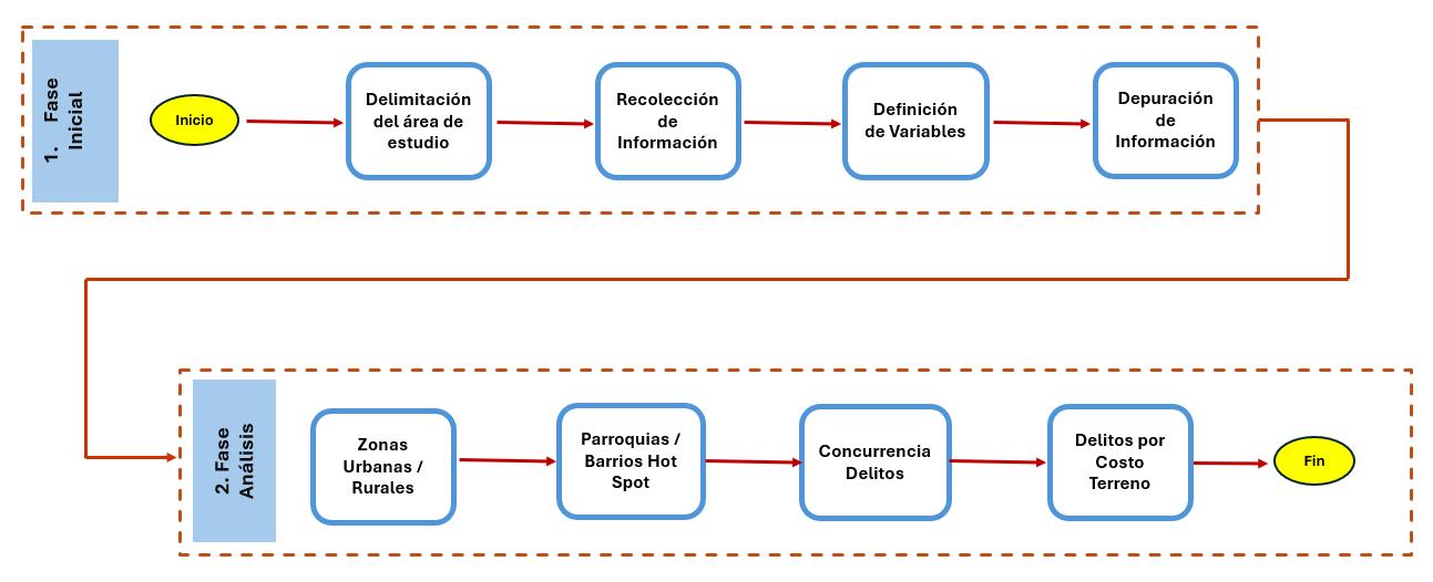 Ante esta situación, se realizó un análisis para identificar los patrones espaciales y temporales de la delincuencia en el DMQ. Para ello, se utilizaron herramientas de Sistemas de Información Geográfica (SIG), como ArcGIS Pro, aplicando una metodología cuantitativa. El análisis incluyó la creación de mapas temáticos y gráficos, integrando técnicas de análisis espacial y geoprocesamiento, como Optimized Hot Spot Analysis y el Analysis 80-20, que permitieron determinar áreas críticas. También se analizaron las tendencias y patrones concurrentes de la delincuencia, obteniendo patrones fluctuantes, persistentes y decrecientes a través de la generación de un cubo espacio-tiempo, complementado con la herramienta Emerging Hot Spot Analysis. Además, se evaluó la relación entre el costo del terreno y las incidencias delictivas mediante un enfoque cuantitativo que combinó análisis espacial y estadístico.