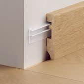 Für die Verlegung von Parkettfußleisten. Bringen Sie die Schiene mit Schrauben oder dem One4All-Klebstoff an der Wand an und klicken Sie dann die Sockelleisten darin ein.
