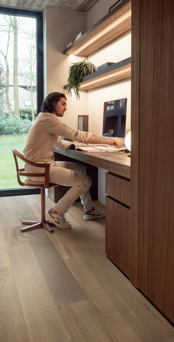 O seu pavimento nunca terá um aspeto sujo ou escuro. Graças a um sistema de revestimento único que cobre toda a superfície, mesmo nas texturas de superfície mais profundas. A sujidade não adere à madeira!