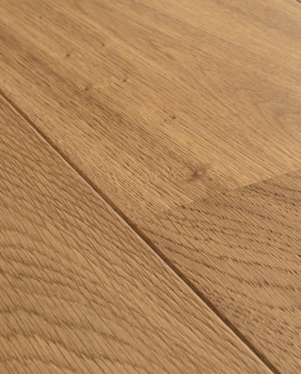 Une couche de vernis appliquée sur la surface du parquet permet de refermer les pores du bois. Si vous optez pour un vernis extra mat, votre parquet obtiendra l’aspect doux du bois huilé. Le parquet verni Quick-Step possède jusqu’à sept couches de vernis à base d’eau, durcies aux UV. C’est ainsi que nous vous facilitons l’entretien et protégeons votre sol contre l’usure, les rayures et les taches.