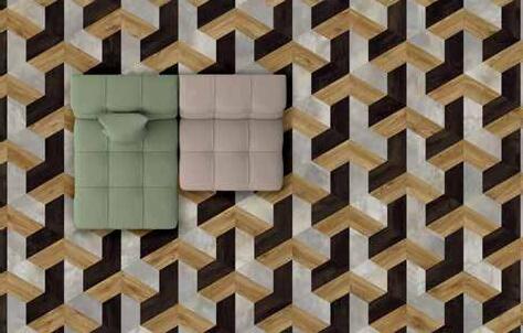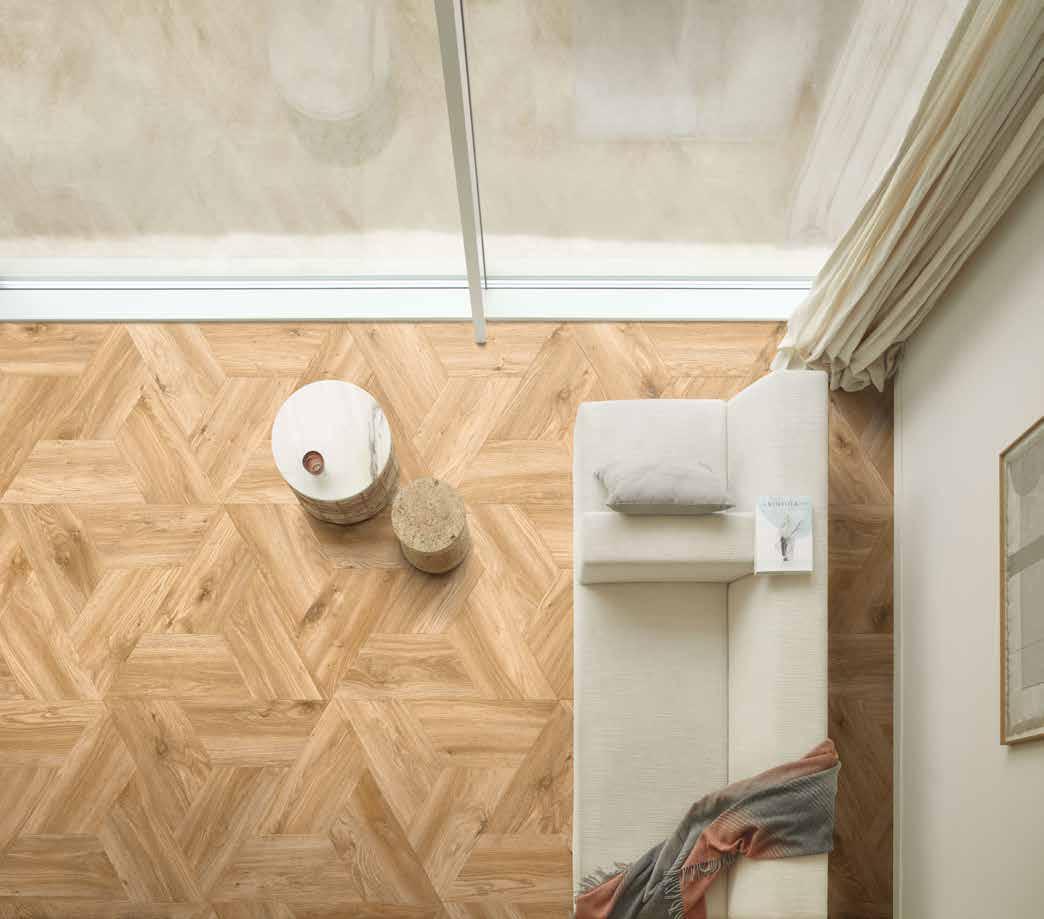 Imagine the checker board pattern with a new dimension. Literally. The combination of woody hues and grey tones almost gives the floor a dramatic look, with a vibrant contrast between colours and materials. Looking to add more character to your room? This absolute eye-catcher fills any space without effort.